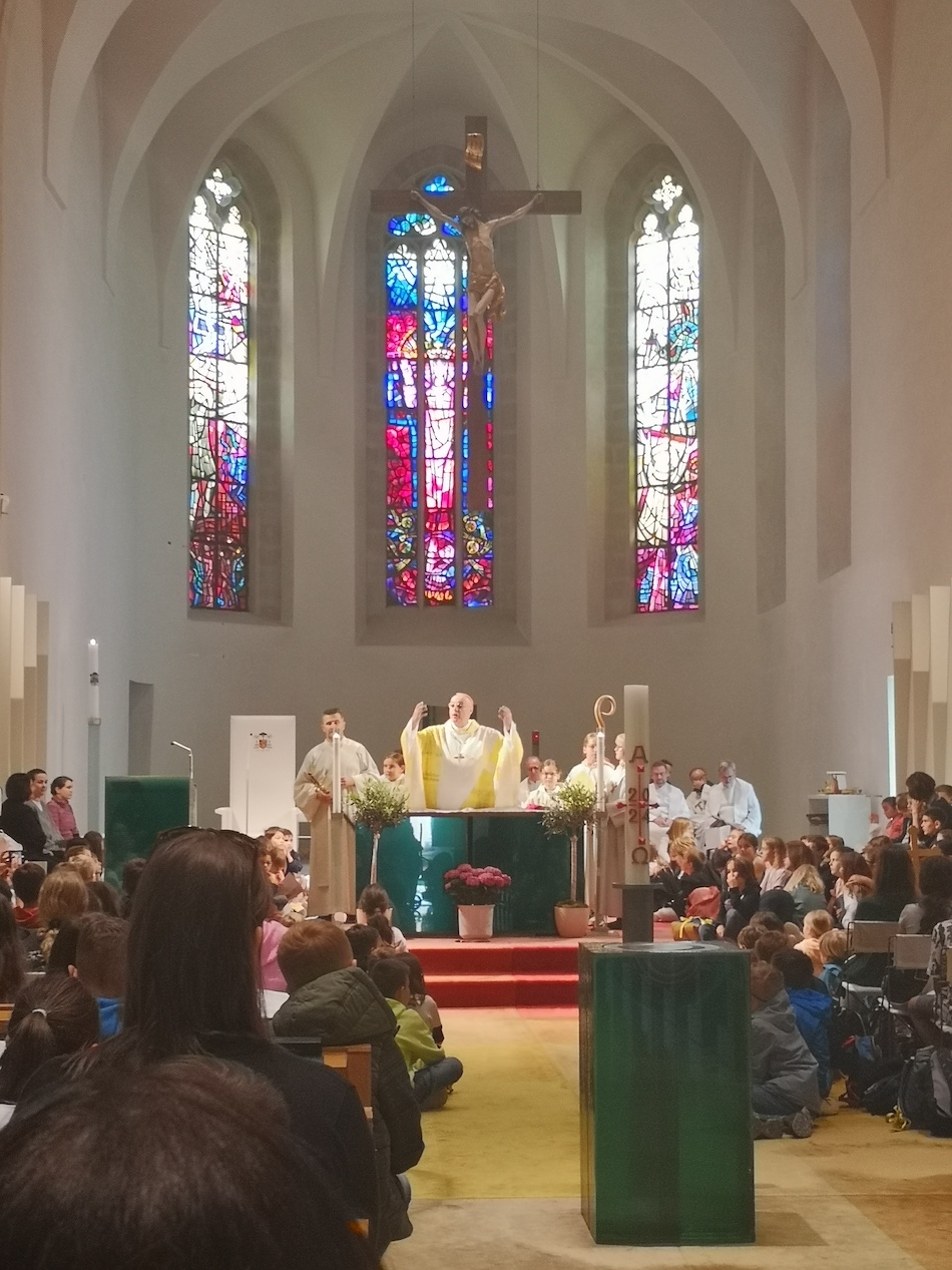 Mi, osnovna škola Kalištrof i Bajngrob smo bili diozematelji na ovom ugodanom shodišću. Putovali smo s busom u Željezno. Onde smo se otšetali u katedralu sv. Martina kade smo skupno s biškupom dr. Egidijom Žikovićem i prik 600 nazočne dice i učiteljstva svečevali i oblikovali svetu mašu.
