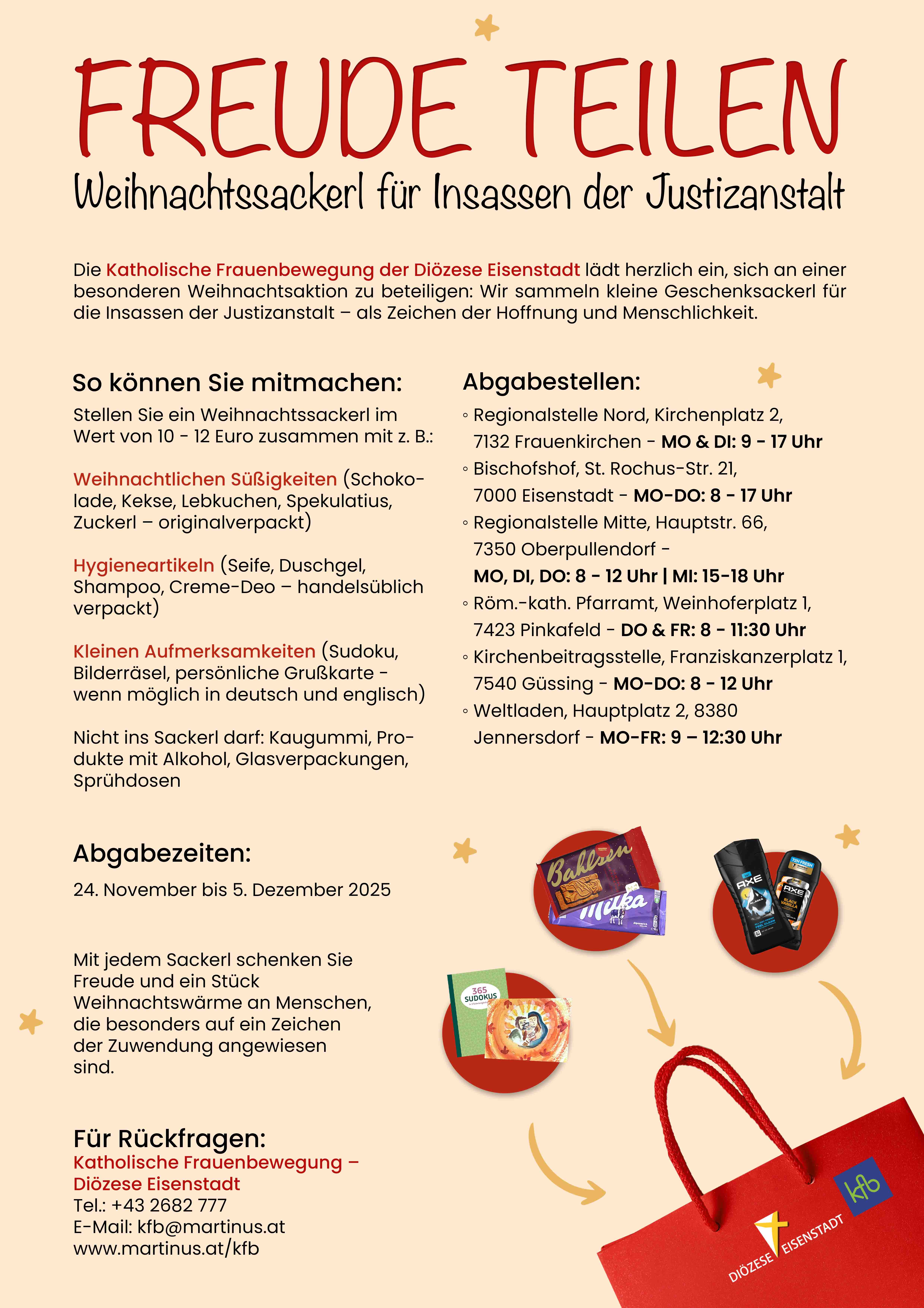Die Katholische Frauenbewegung der Diözese Eisenstadt lädt herzlich ein, sich an einer besonderen Weihnachtsaktion zu beteiligen: Wir sammeln kleine Geschenksackerl für die Insassinnen der Justizanstalt Schwarzau - als Zeichen der Hoffnung und Menschlichkeit.