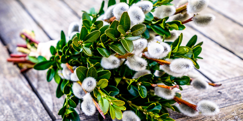 Palmkätzchen und Schüssel mit (Weih-)Wasser