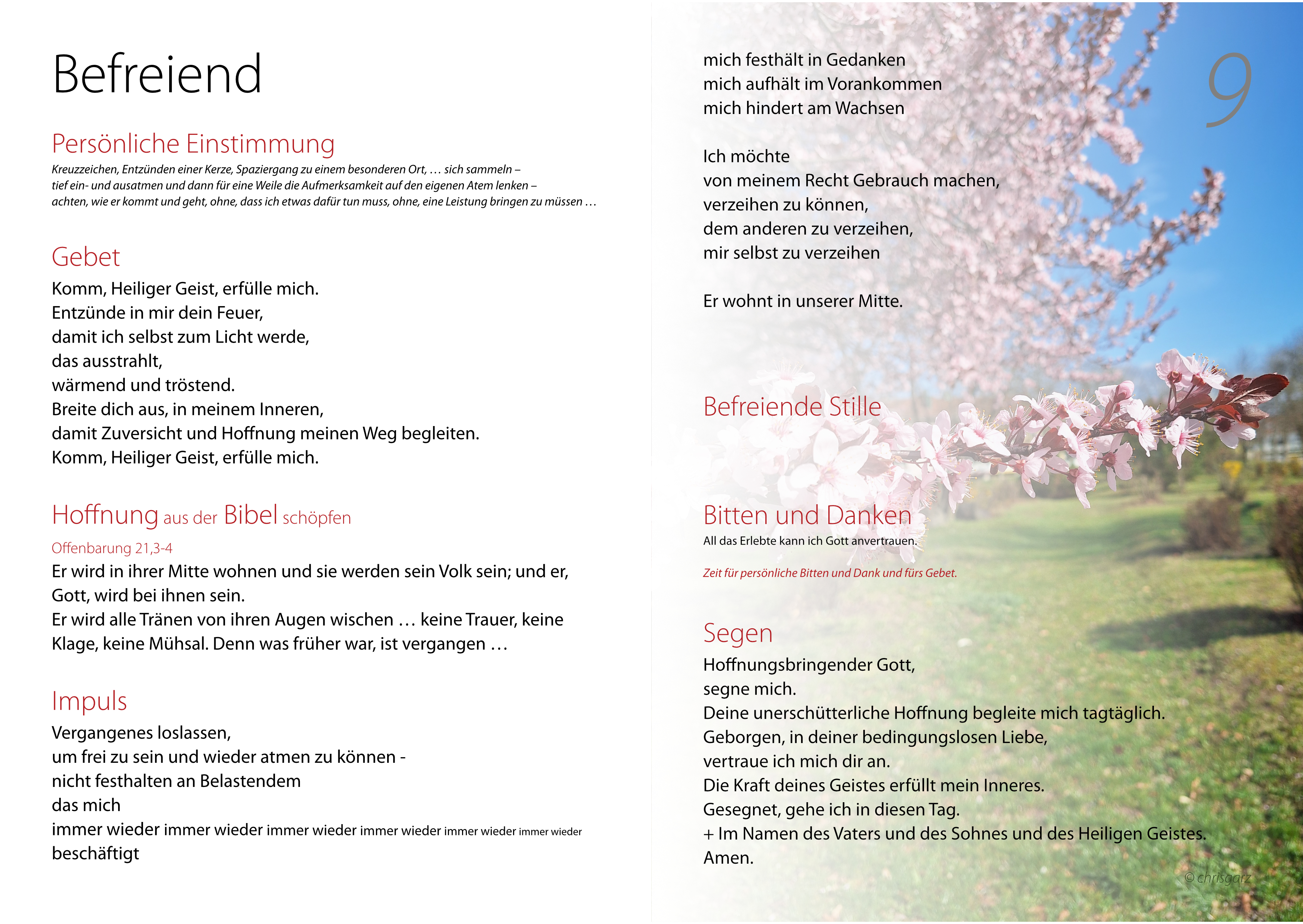 Gleichbleibende Gebete und wechselnde Impulse begleiten uns in dieser Zeit der inneren Erkenntnis und Erfahrung, Gott zu begegnen, mir selbst Gutes zu tun und auch Hoffnung zu schenken.