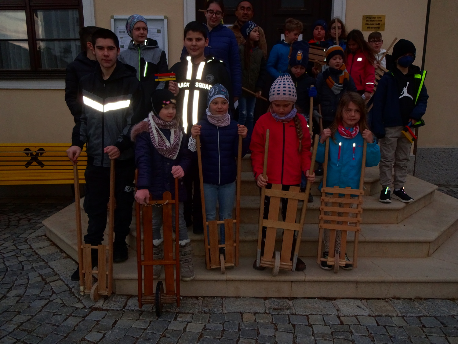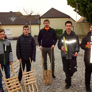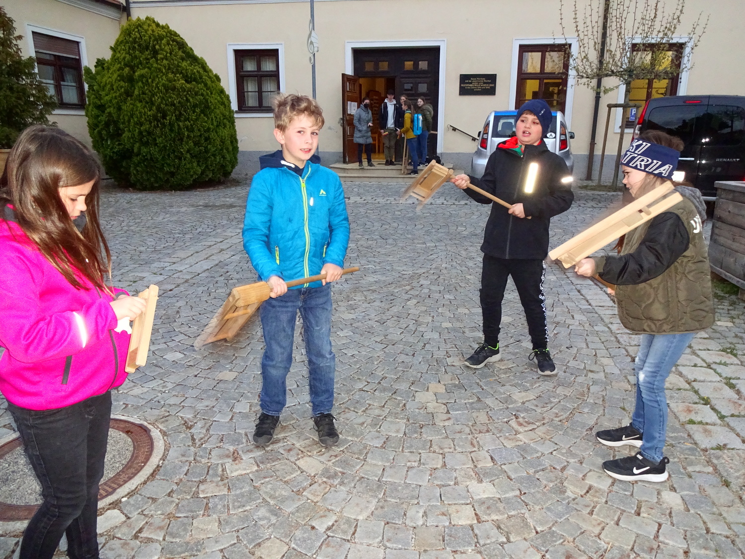 in das Pfarrheim und machten sich mit ihren Ratschen