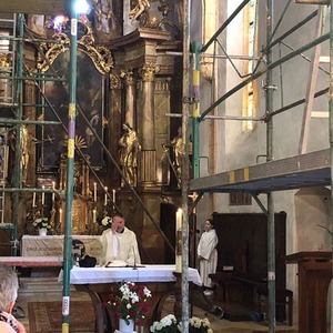 Befundung für Restaurierung der Kirche - Heilige Messe trotz Gerüst