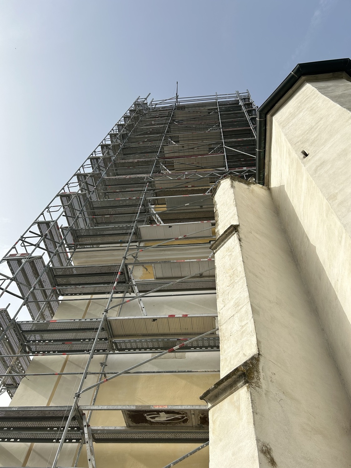 Aktuell ist alles im Zeitplan. Die Gerüstbauer haben bereits 13 Etagen geschafft und werden voraussichtlich morgen mit dem größten Teil fertig. Die Eingerüstung des Spitzes erfolgt dann zeitgleich mit der Einnetzung des unteren Teils. Voraussichtlich kann nächste Woche schon mit dem Sandstrahlen begonnen werden.