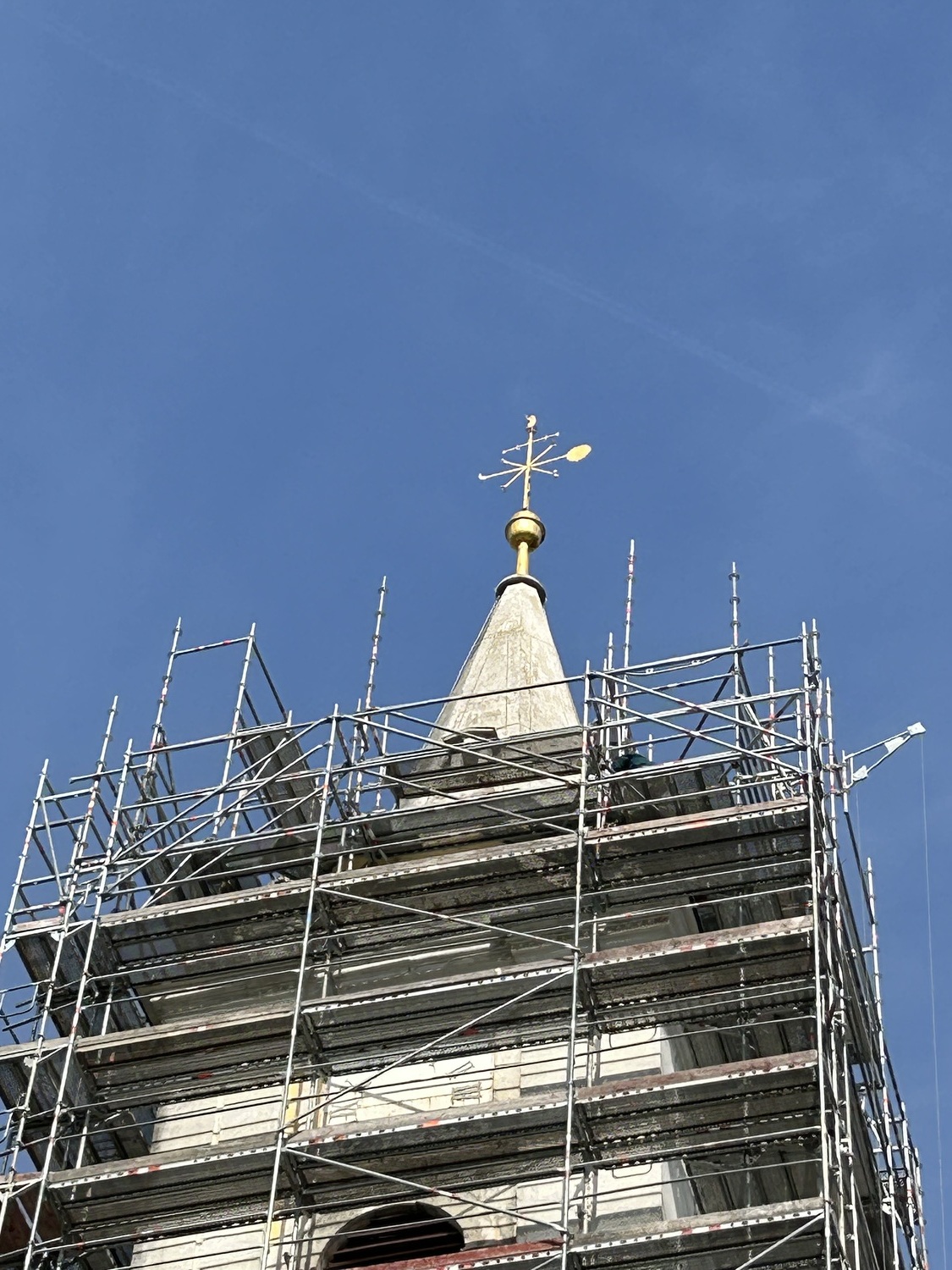 Nach einer sturmbedingten Pause - „Das Gerüste hat dem Sturm Gott sei Dank standgehalten“- konnte heute mit der Eingerüstung der Turmspitze begonnen werden. Im unteren Bereich wurden bereits Staubnetze angebracht. Wenn alles nach Plan weitergeht, kann bereits am Montag mit dem Sandstrahlen begonnen werden.