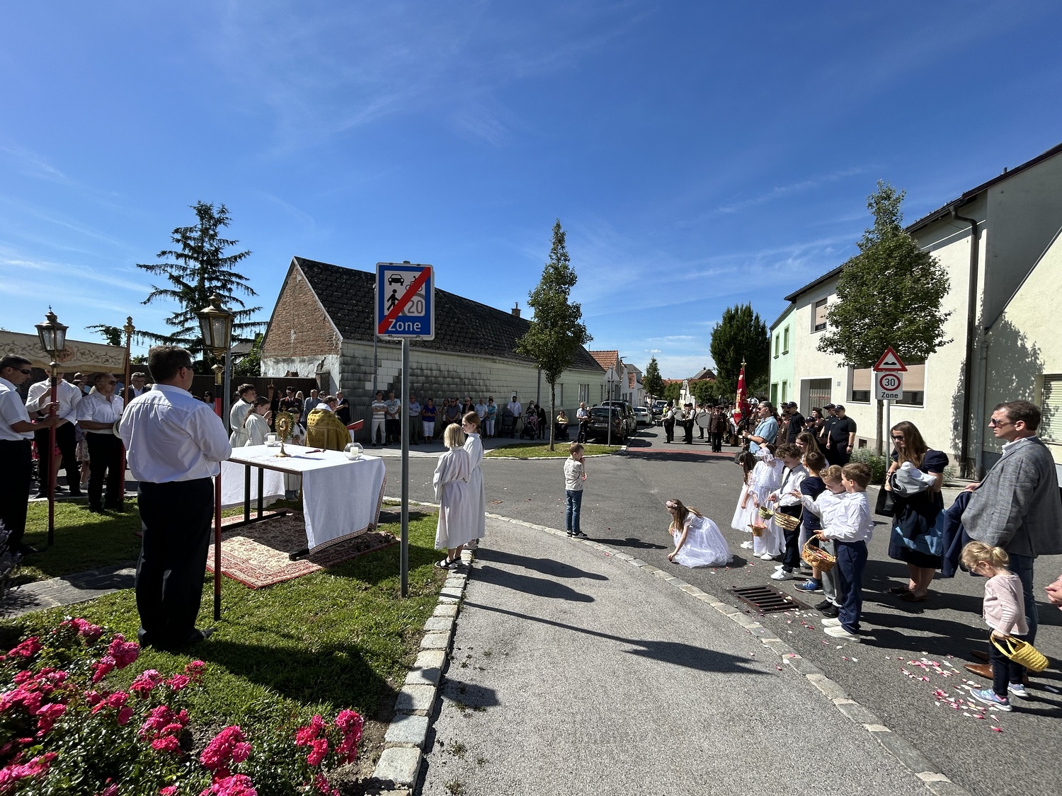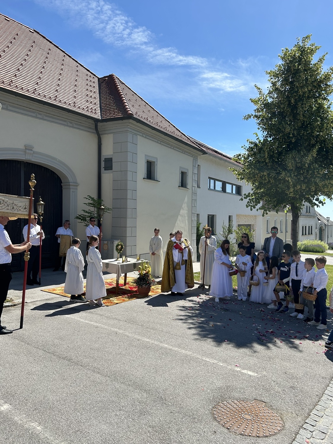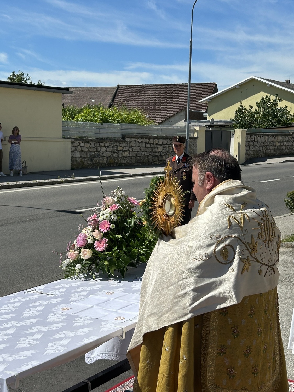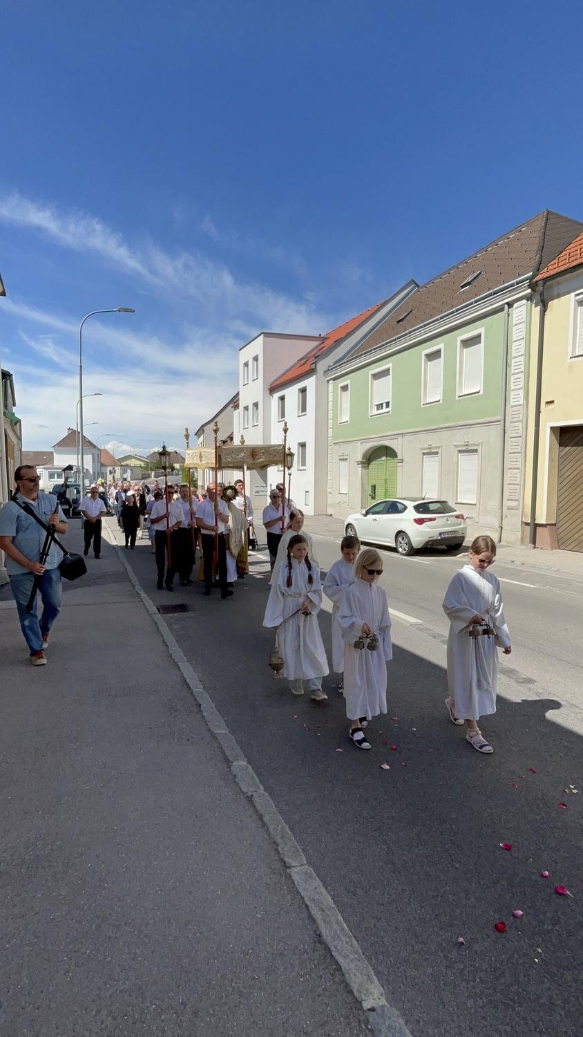 Heute waren wieder die Häuser, Straßen und Plätze im Dorf in der Stadt geschmückt. Nach der Hl. Messe in der Pfarrkirche wurde die Prozession zu den 4 Altären im Dorf von der Winzerkapelle Kleinhöflein, der Freiwilligen Feuerwehr, den Sänger:innen , den Erstkommunionskindern von Kleinhöflein, sowie zahlreichen Kindern und Gläubigen begleitet. Alles zur Ehre Gottes, den wir in Form der Hostie durch unser Dorf trugen.