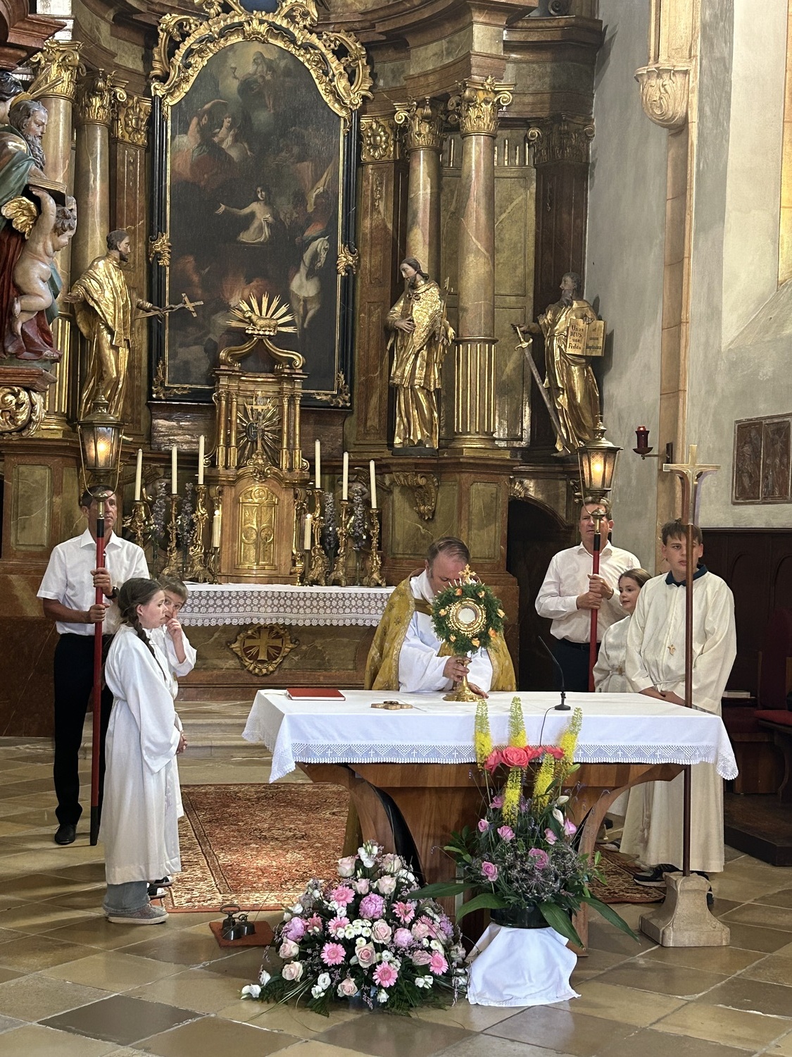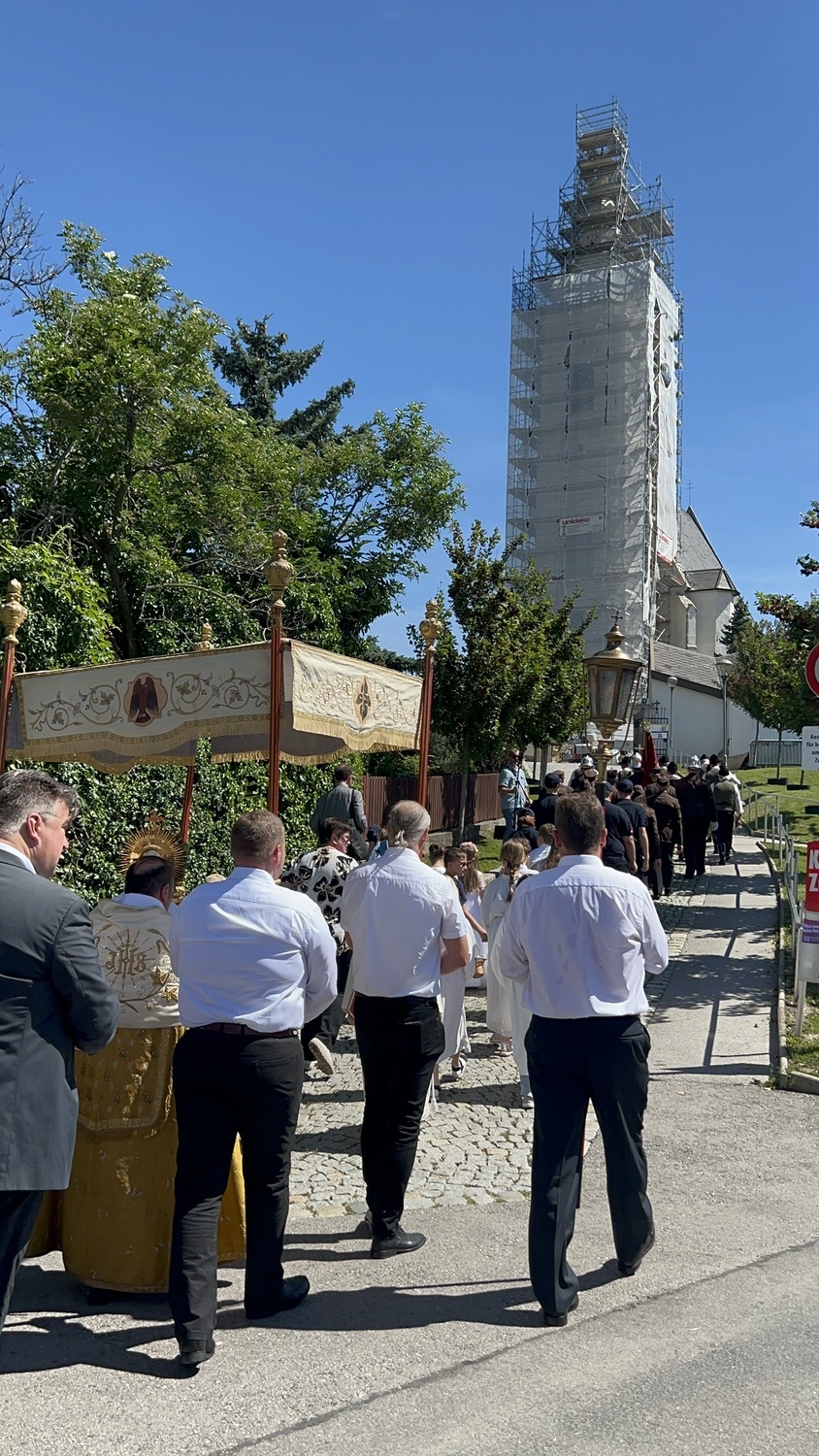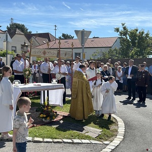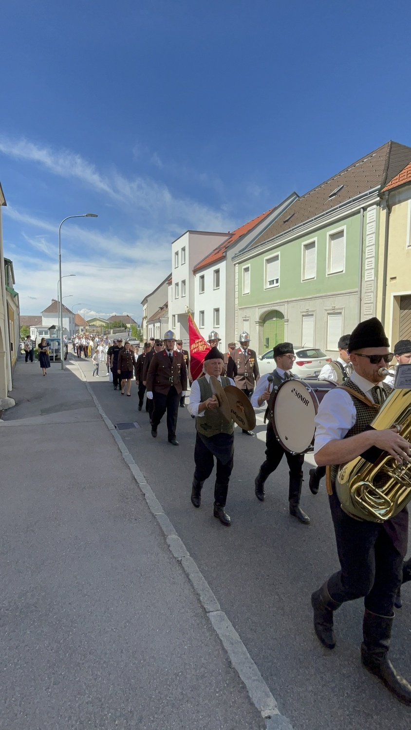 Heute waren wieder die Häuser, Straßen und Plätze im Dorf in der Stadt geschmückt. Nach der Hl. Messe in der Pfarrkirche wurde die Prozession zu den 4 Altären im Dorf von der Winzerkapelle Kleinhöflein, der Freiwilligen Feuerwehr, den Sänger:innen , den Erstkommunionskindern von Kleinhöflein, sowie zahlreichen Kindern und Gläubigen begleitet. Alles zur Ehre Gottes, den wir in Form der Hostie durch unser Dorf trugen.
