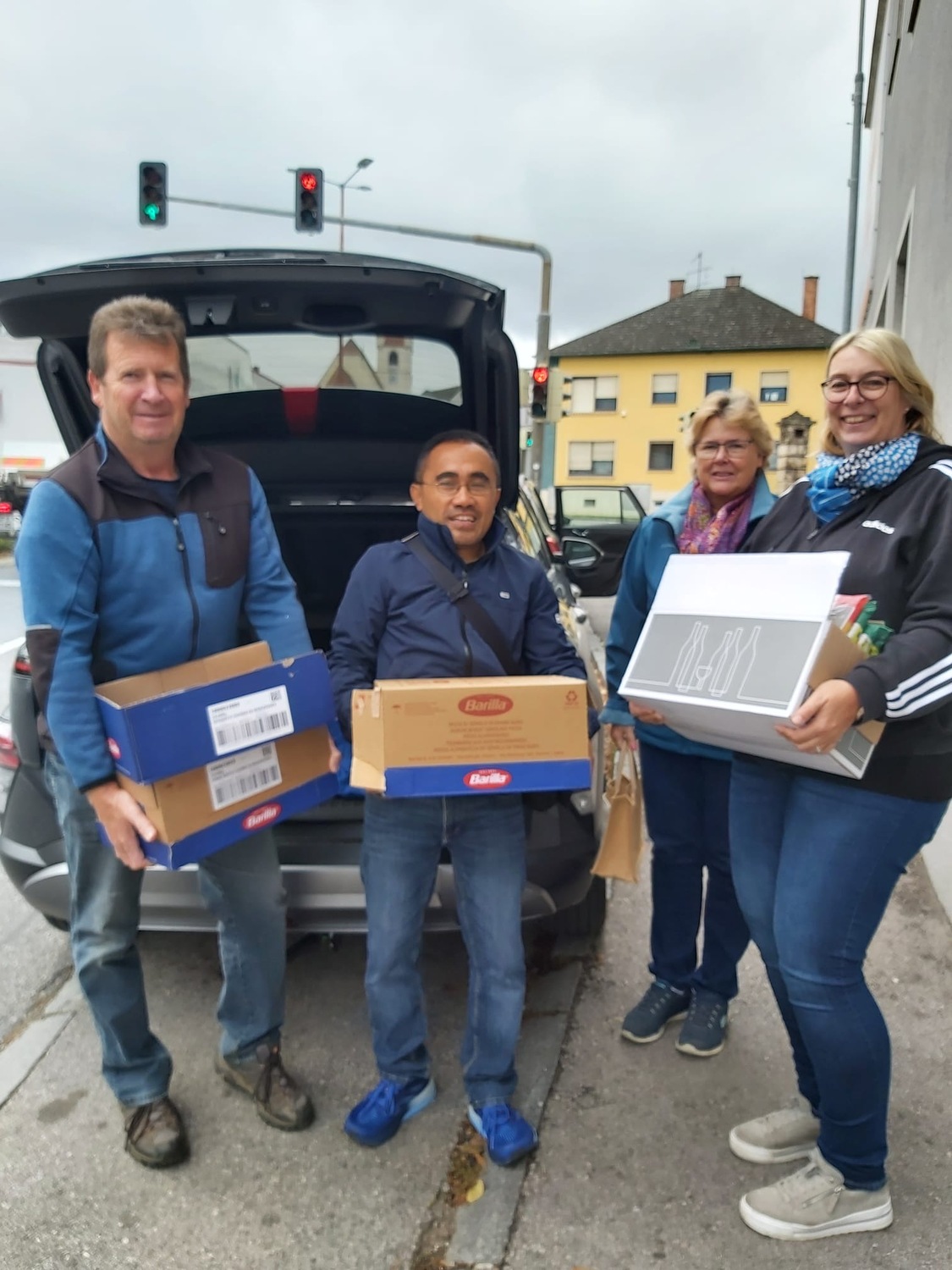 Beim Erntedankfest am Sonntag waren die Körbe vor dem Altar leer. Diese wurden mit mitgebrachten Gaben befüllt, welche heute mit einer kleinen Spende an die Pannonische Tafel übergeben wurden.