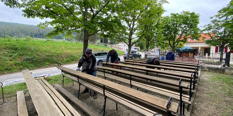 Im Zuge der Sanierung werden seitens der Pfarre auch die Sitzbänke in Eigenregie renoviert. Am Samstag, 7.5.2022 trafen sich einige Pfarrmitglieder um die verwitterten Sitzgelegenheiten rund um die Säule wieder auf Vordermann zu bringen. Diese werden abgeschliffen, grundiert und neu eingelassen, damit auch sie bei der Segnung am 12. Juni 2022 wieder in neuem Glanz erstrahlen und zum Verweilen einladen.
