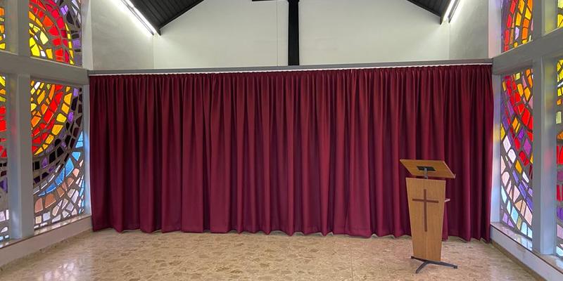 Innerhalb kürzester Zeit wurde nun ein Vorhang mit Schiene gefertigt, welcher es ermöglicht die Kühlung der Verstorbenen letztlich von deren Aufbahrung bei der Verabschiedung räumlich zu trennen und diese würdig zu ermöglichen.