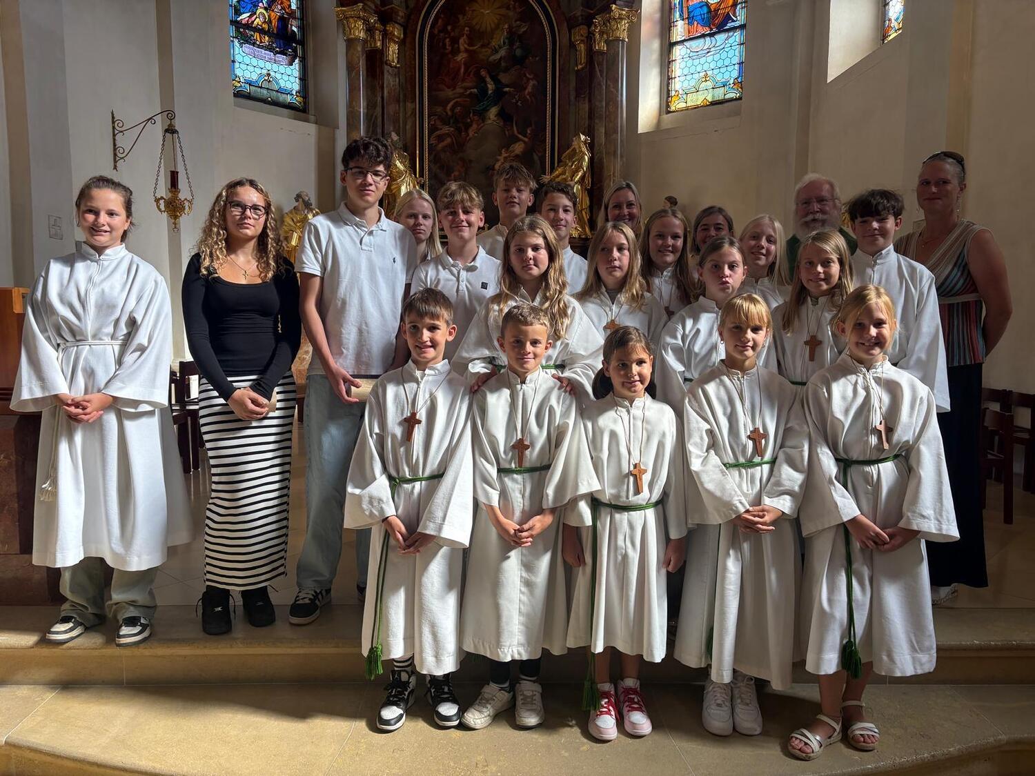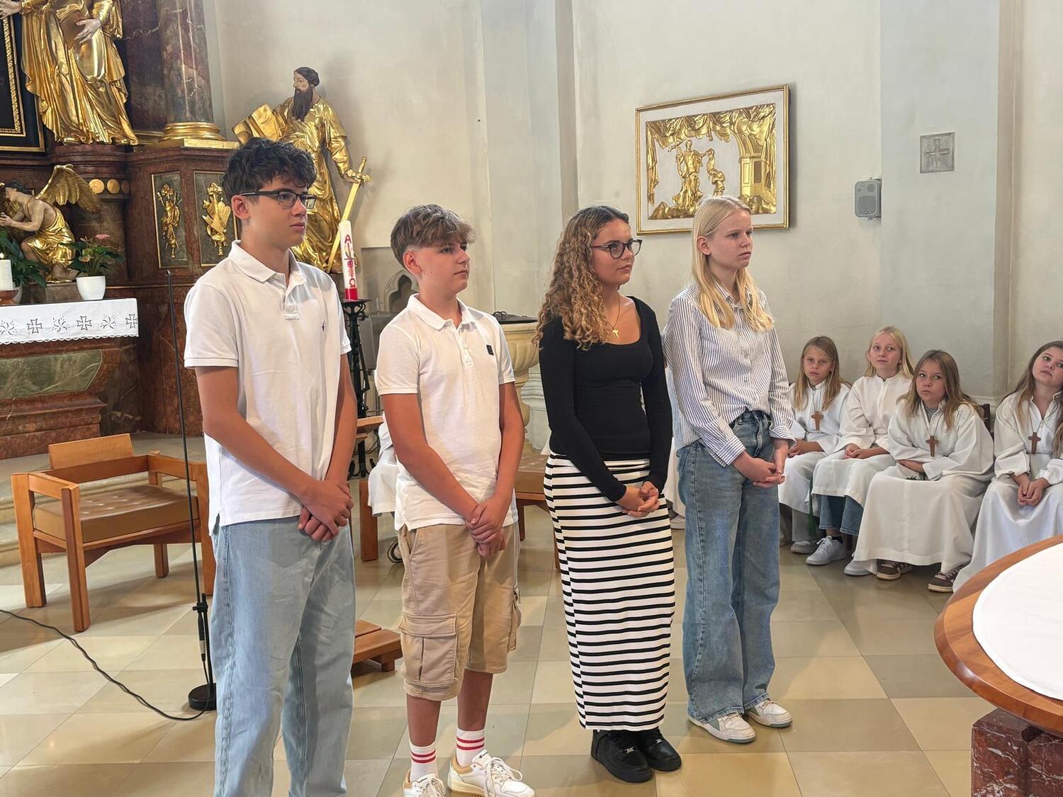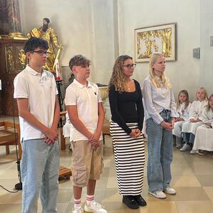 Am Sonntag, den 21. September 2025, wurden im Rahmen eines feierlichen Gottesdienstes vier langjährige und engagierte Ministranten aus ihrem Dienst verabschiedet. Mit großem Dank und herzlicher Anerkennung wurden Johanna Kornfehl, Lea Moritz, Tobias Lang und Alexander Zachs für ihren treuen Einsatz in der Ministrantengemeinschaft geehrt.