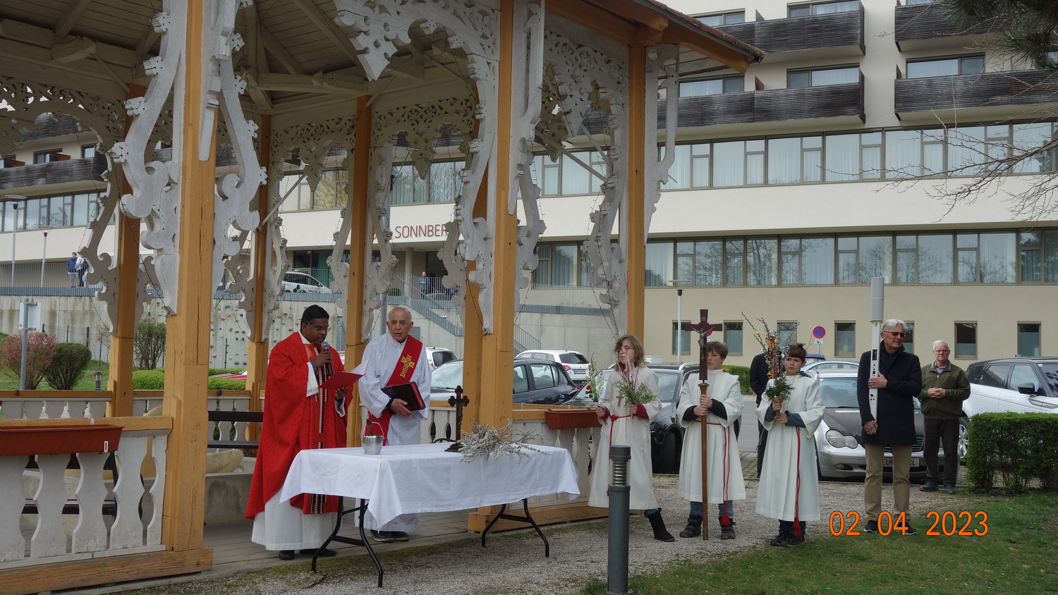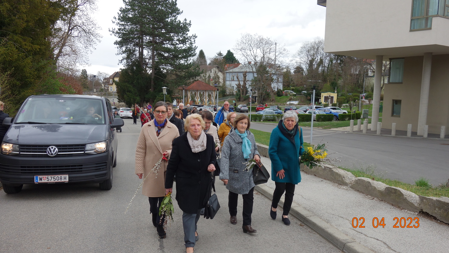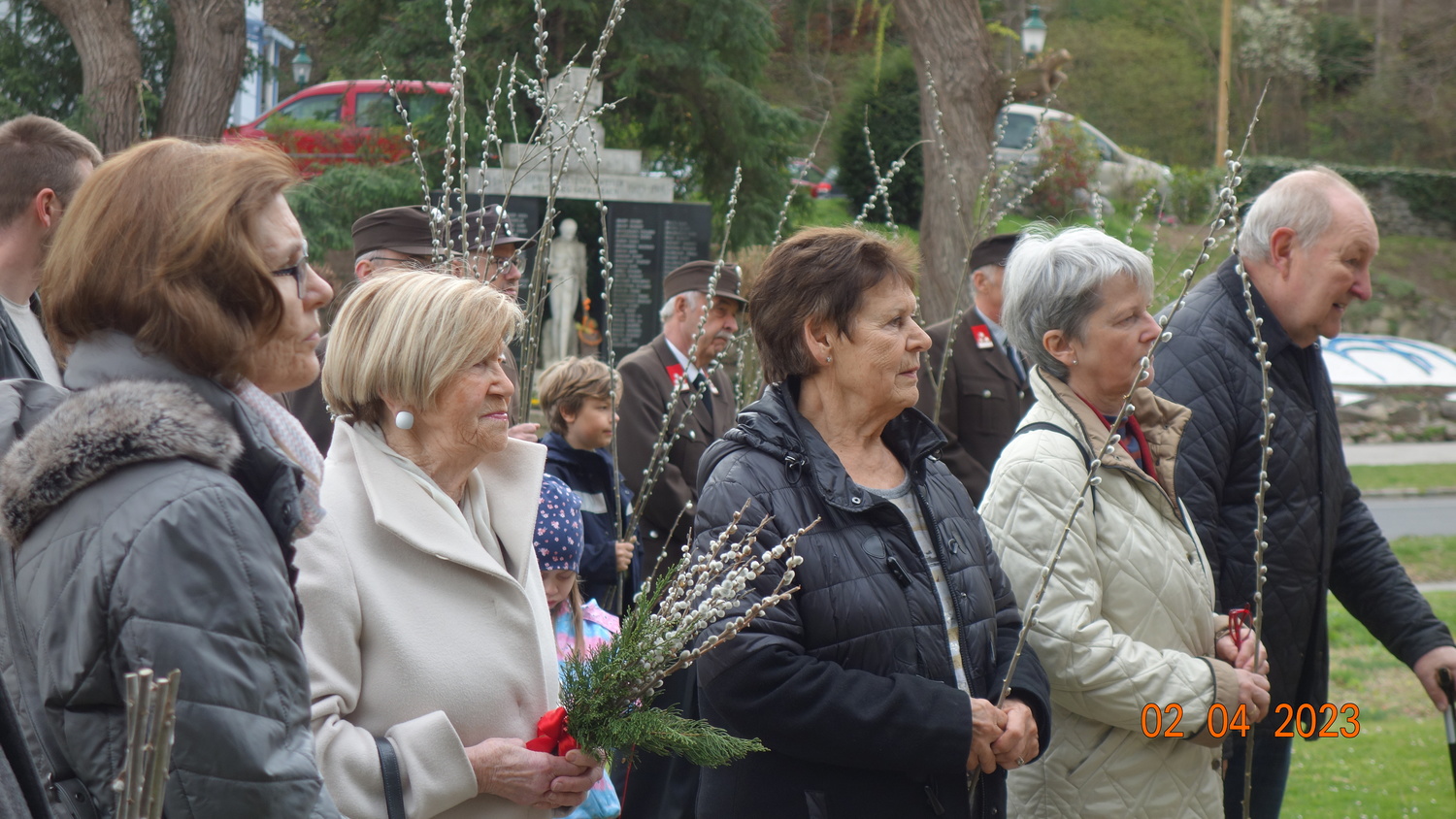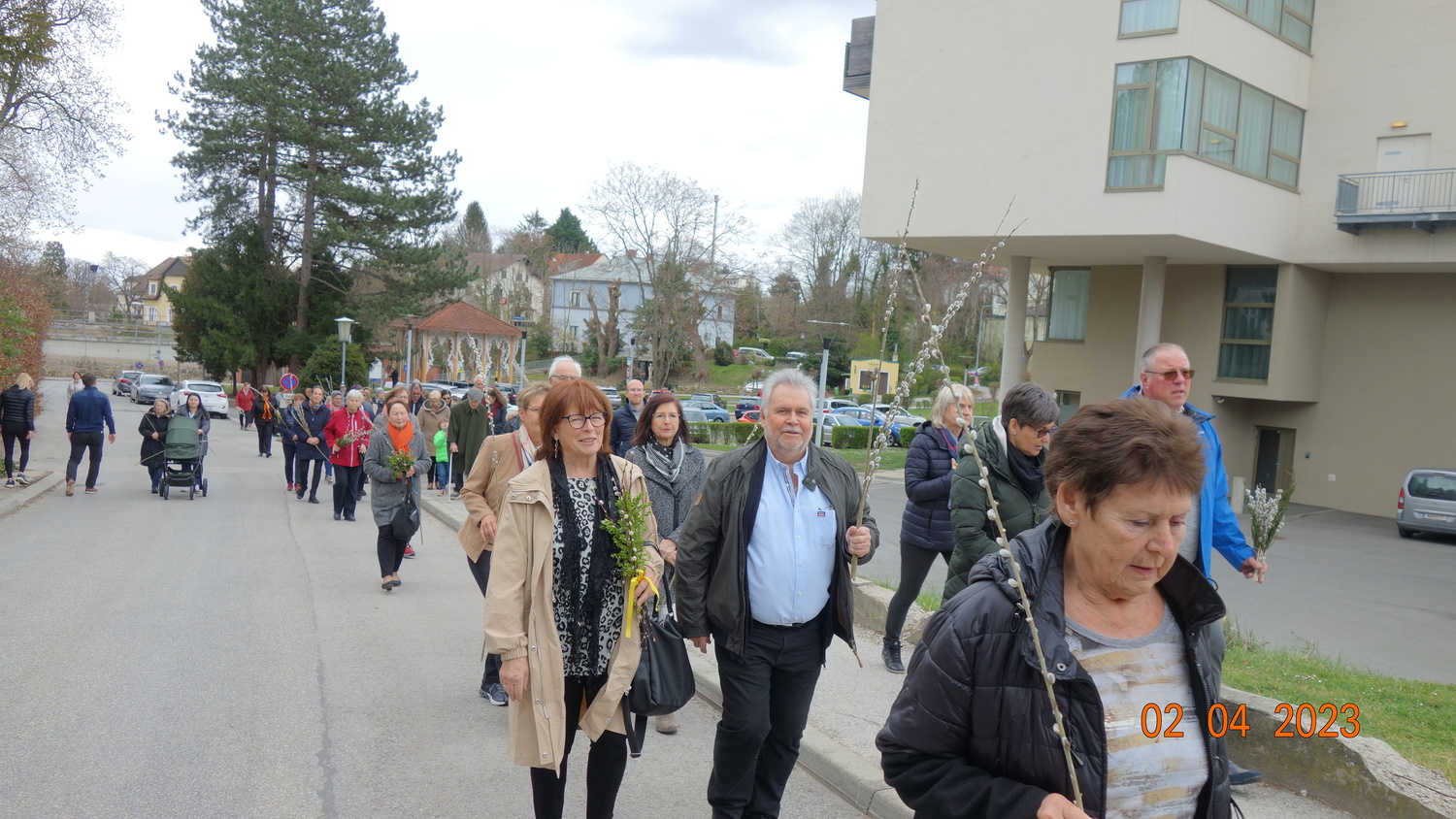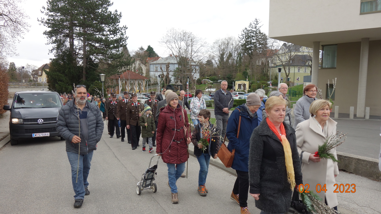 Am Beginn stand die Palmweihe beim Pavillon beim Sonnberghof. Viele Gläubige waren mit ihren Palmzweigen und Palmbuschen zur Palmweihe gekommen, um an der folgenden Palmprozession in die Kirche teilzunehmen. Auch die Feuerwehr Bad Sauerbrunn hatte eine Abordnung gestellt. Zum Glück hielt das Wetter, der Regen kam erst  später, und so konnte die Palmprozession in gewohnter Weise stattfinden.