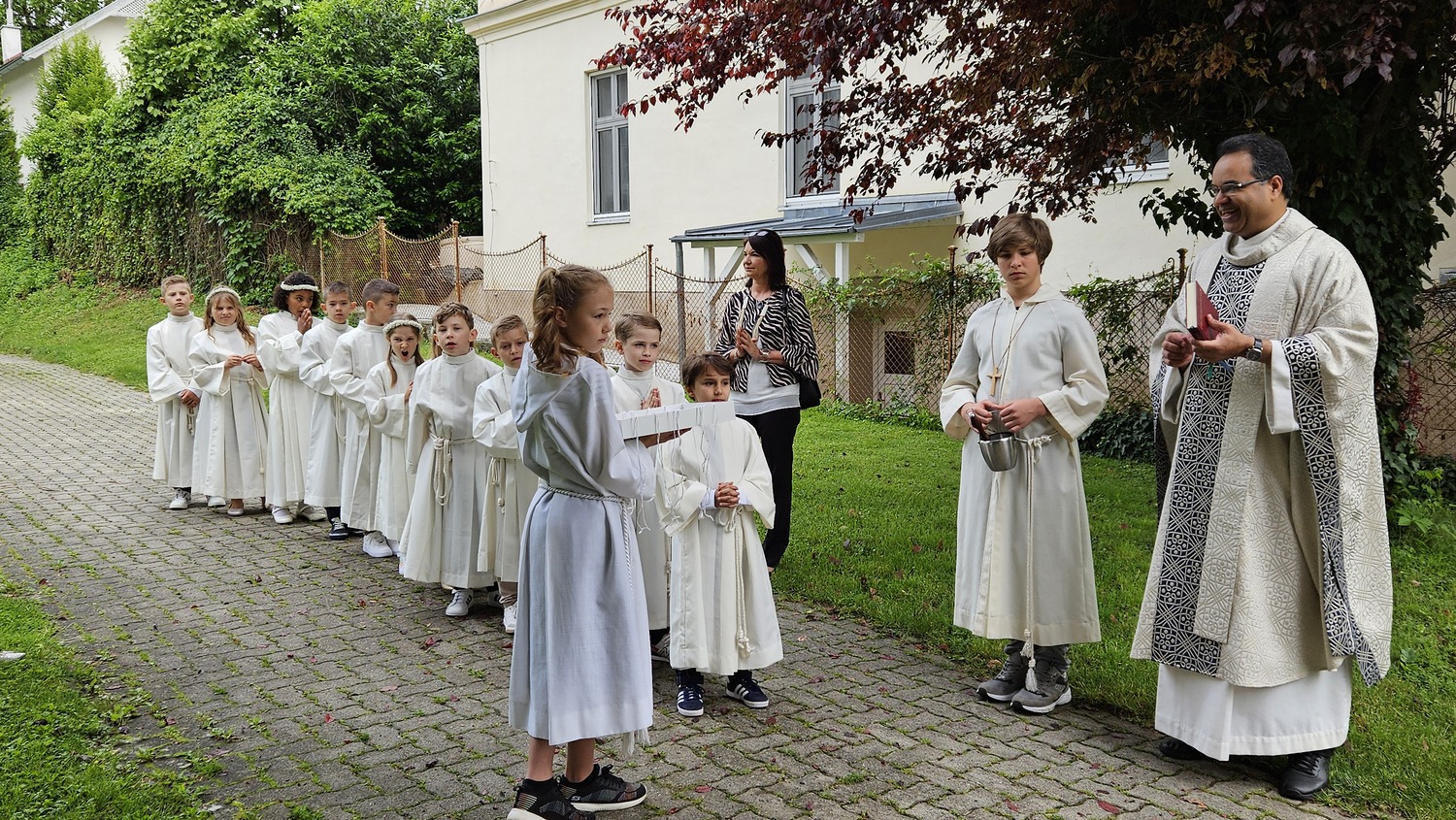 Nach der Erstkommunionsfeier wurde vor dem Kirchenportal ein Foto der Kinder mit Pater Kuruvila und den Lehrerinnen Barbara Klavacs und Beatrix Lenz gemacht, die die Kinder für die Hl. Messe vorbereitet hatten, Texte und Lieder mit den Kindern einstudiert haben.