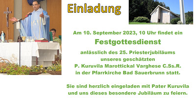 Pater Kuruvila Marottickal Varghese C.Ss.R. feiert heuer sein 25jähriges Priesterjubiläum. In Bad Sauerbrunn findet zu diesem Jubiläum am 10. September um 1000 Uhr ein Festgottesdienst statt.