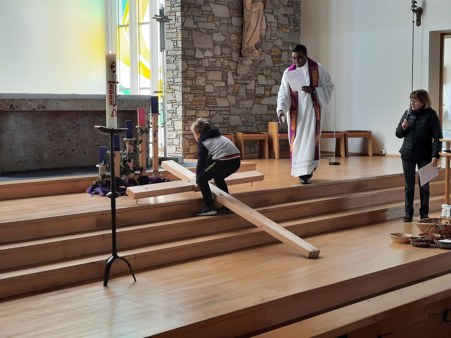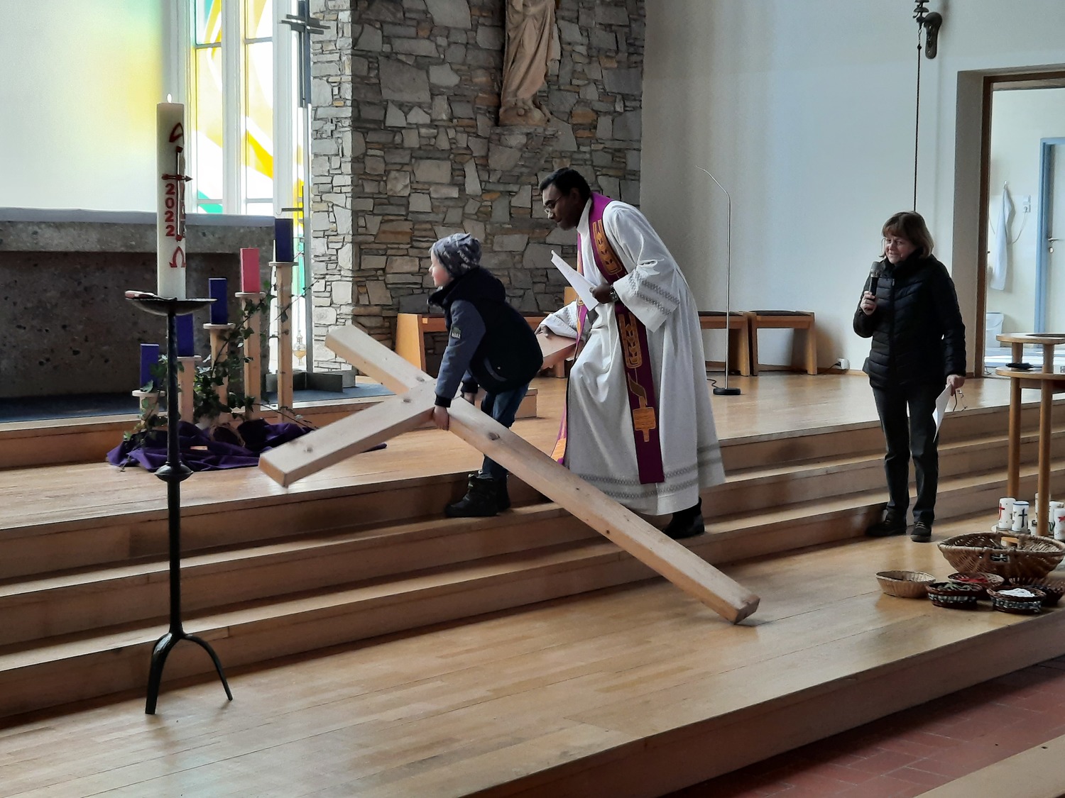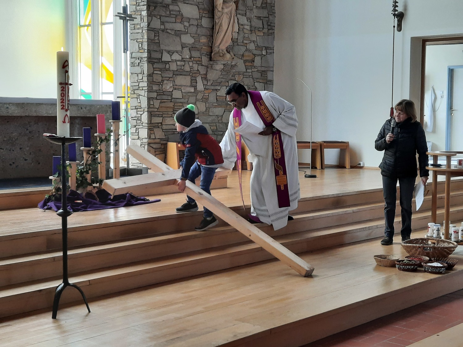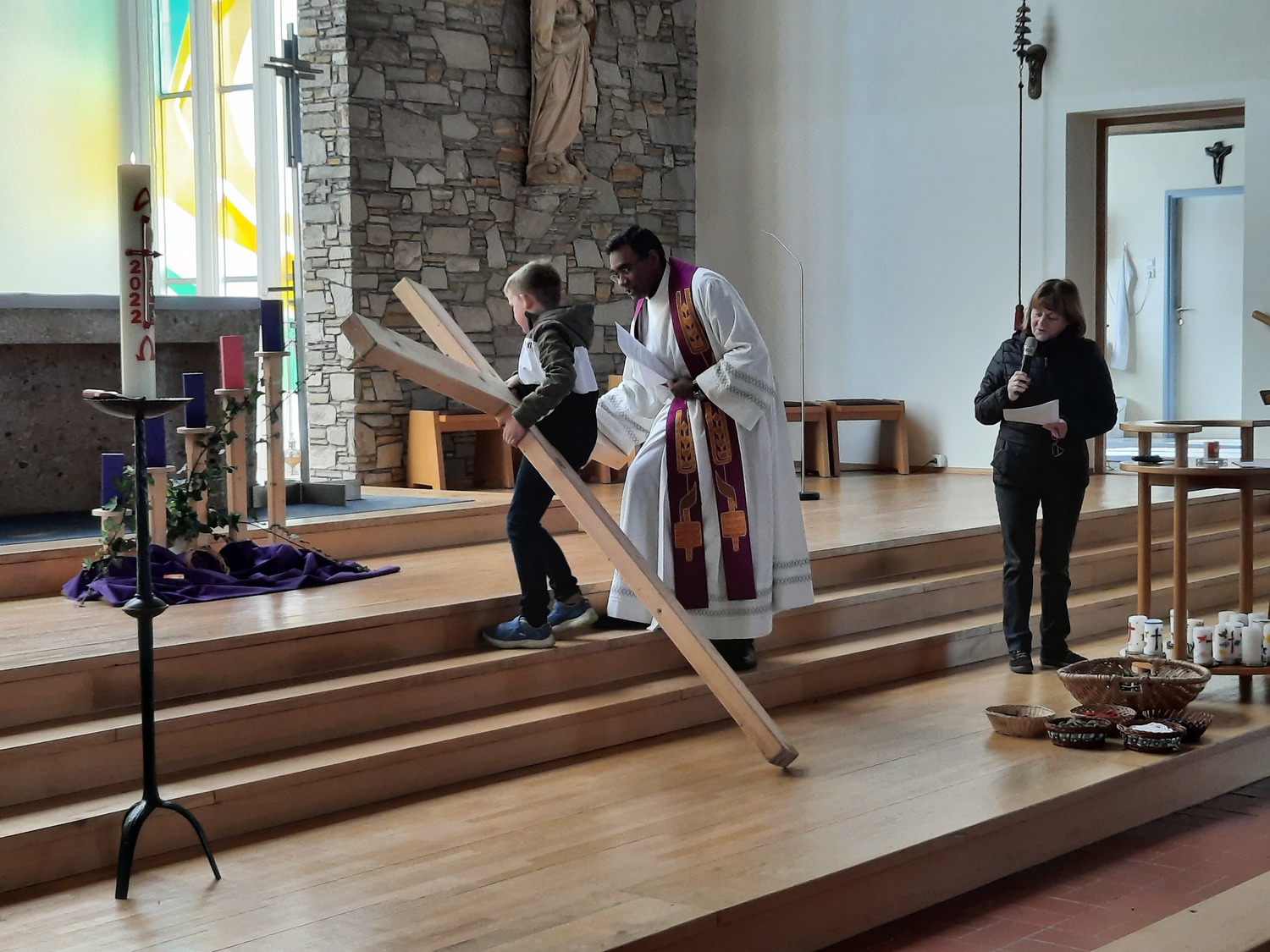 Bevor ausgewählte Stationen des Kreuzweges betrachtet und von Pfarrer Jomon erklärt wurden, durften einige Kinder versuchen ein großes Holzkreuz zu heben, um festzustellen wie schwer Jesus zu tragen hatte. Anschließend bekamen die Kinder einfache gebastelte Kreuze ausgeteilt, die dann bei den Stationen mit Bändern in den Farben Rot für Blut, Blau für die Tränen, Grün für die Hoffnung und Schwarz für den Tod von ihnen geschmückt wurden. Ein weißes Band durften die Kinder mit nach Hause nehmen um es zu Ostern, als Symbol der Auferstehung hinzuzufügen.