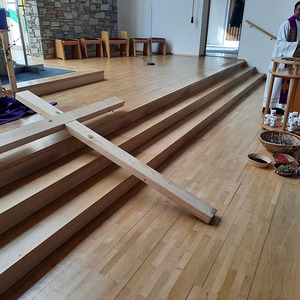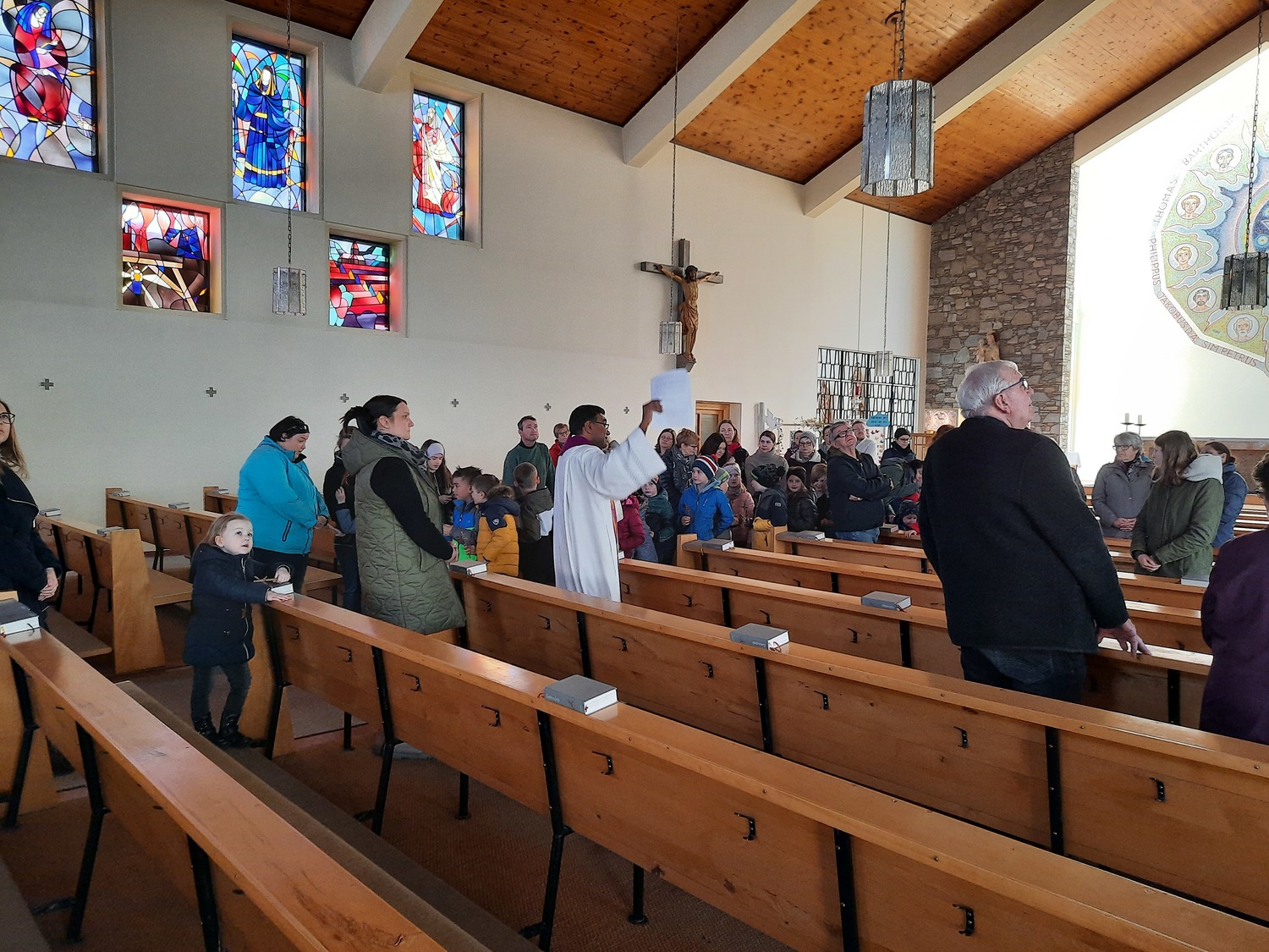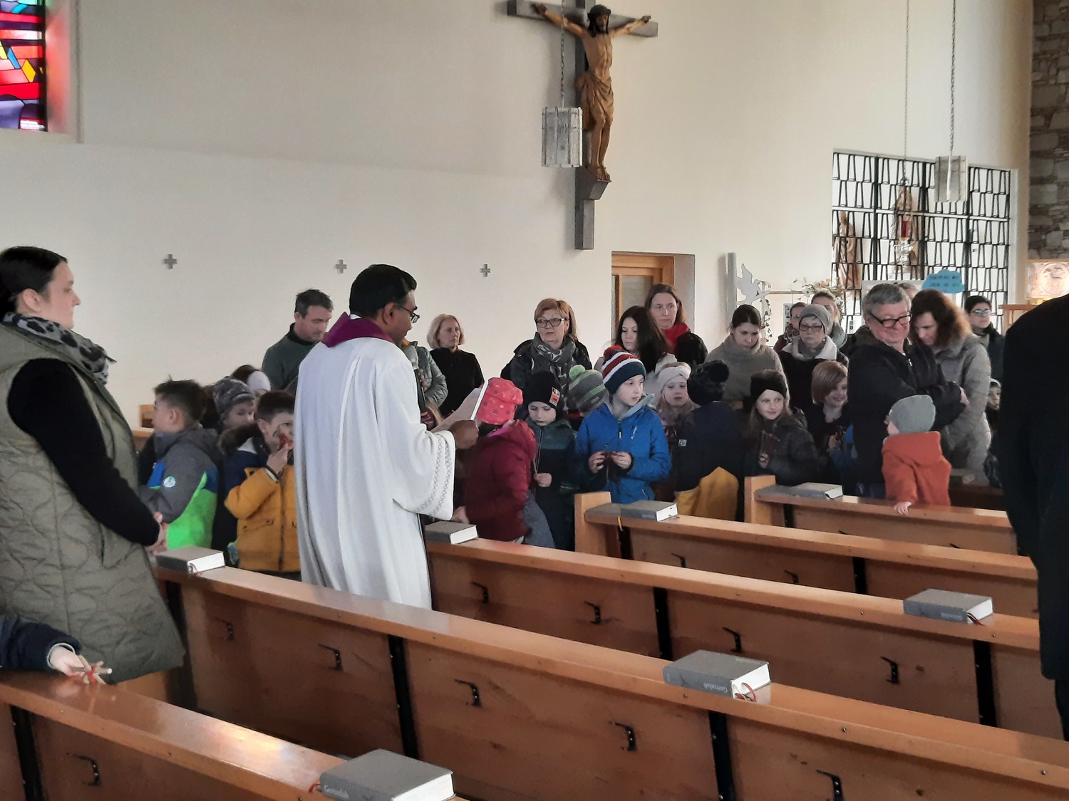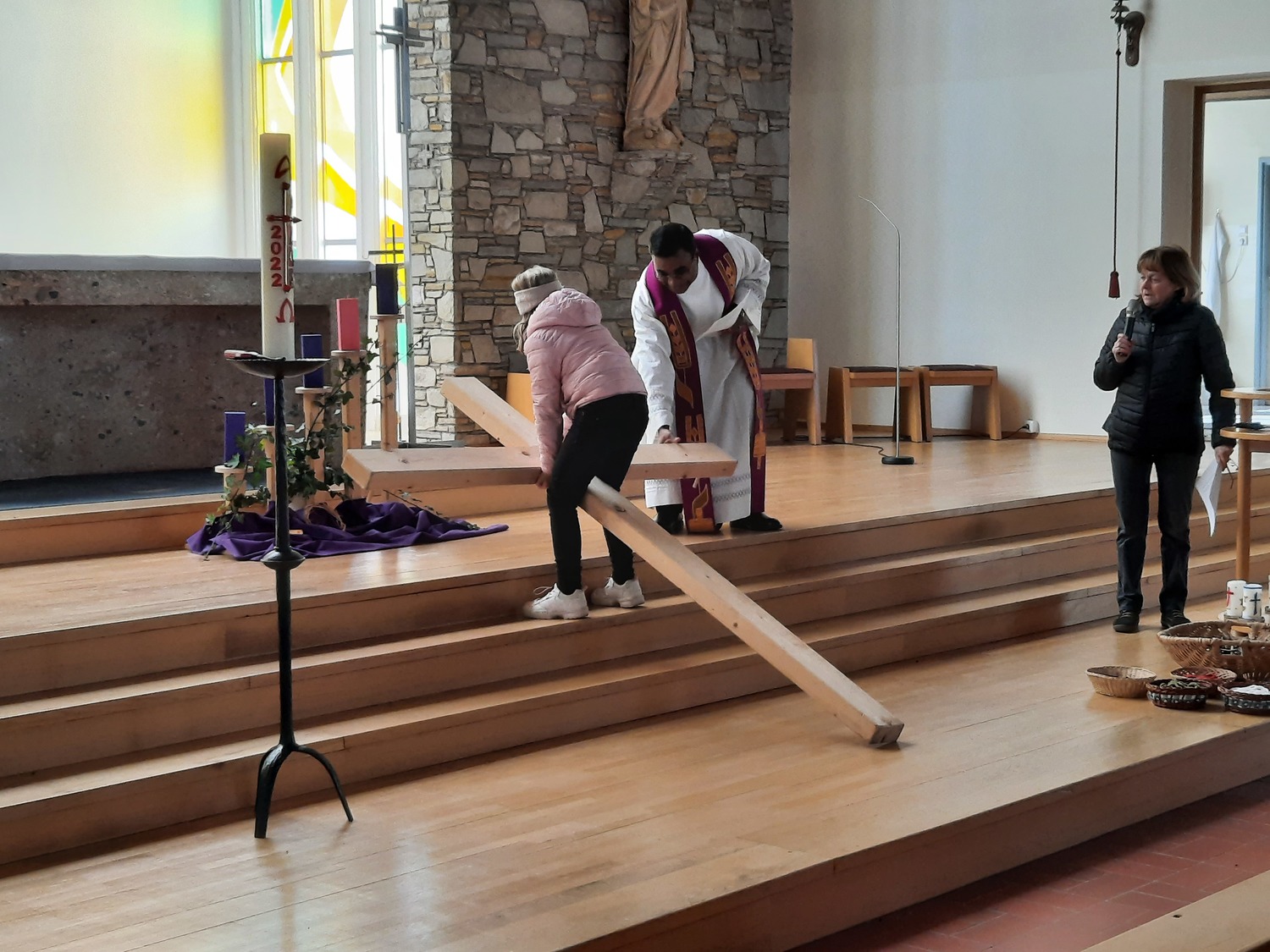 Bevor ausgewählte Stationen des Kreuzweges betrachtet und von Pfarrer Jomon erklärt wurden, durften einige Kinder versuchen ein großes Holzkreuz zu heben, um festzustellen wie schwer Jesus zu tragen hatte. Anschließend bekamen die Kinder einfache gebastelte Kreuze ausgeteilt, die dann bei den Stationen mit Bändern in den Farben Rot für Blut, Blau für die Tränen, Grün für die Hoffnung und Schwarz für den Tod von ihnen geschmückt wurden. Ein weißes Band durften die Kinder mit nach Hause nehmen um es zu Ostern, als Symbol der Auferstehung hinzuzufügen.