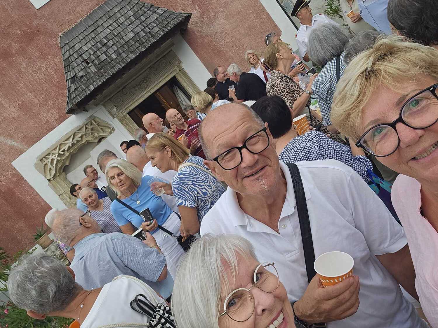 Nach dem Gottesdienst lud Dechant Shinto die Messeteilnehmer im Garten vor der Schlosskapelle zu einer Agape mit div. Gebäck, Grammel-Pogatscherl, Kuchen, Mineralwasser und Wein ein. Der Herr Dechant bedankte sich auch bei der Raiffeisenbank Draßmarkt-Kobersdorf-St. Martin und bei der Firma Waldquelle Kobersdorf für die Unterstützung und bei Schloss-Besitzerin Dr. Anna Schlanitz für die Möglichkeit, in der altehrwürdigen Schlosskapelle diese Hl. Messe zu feiern.