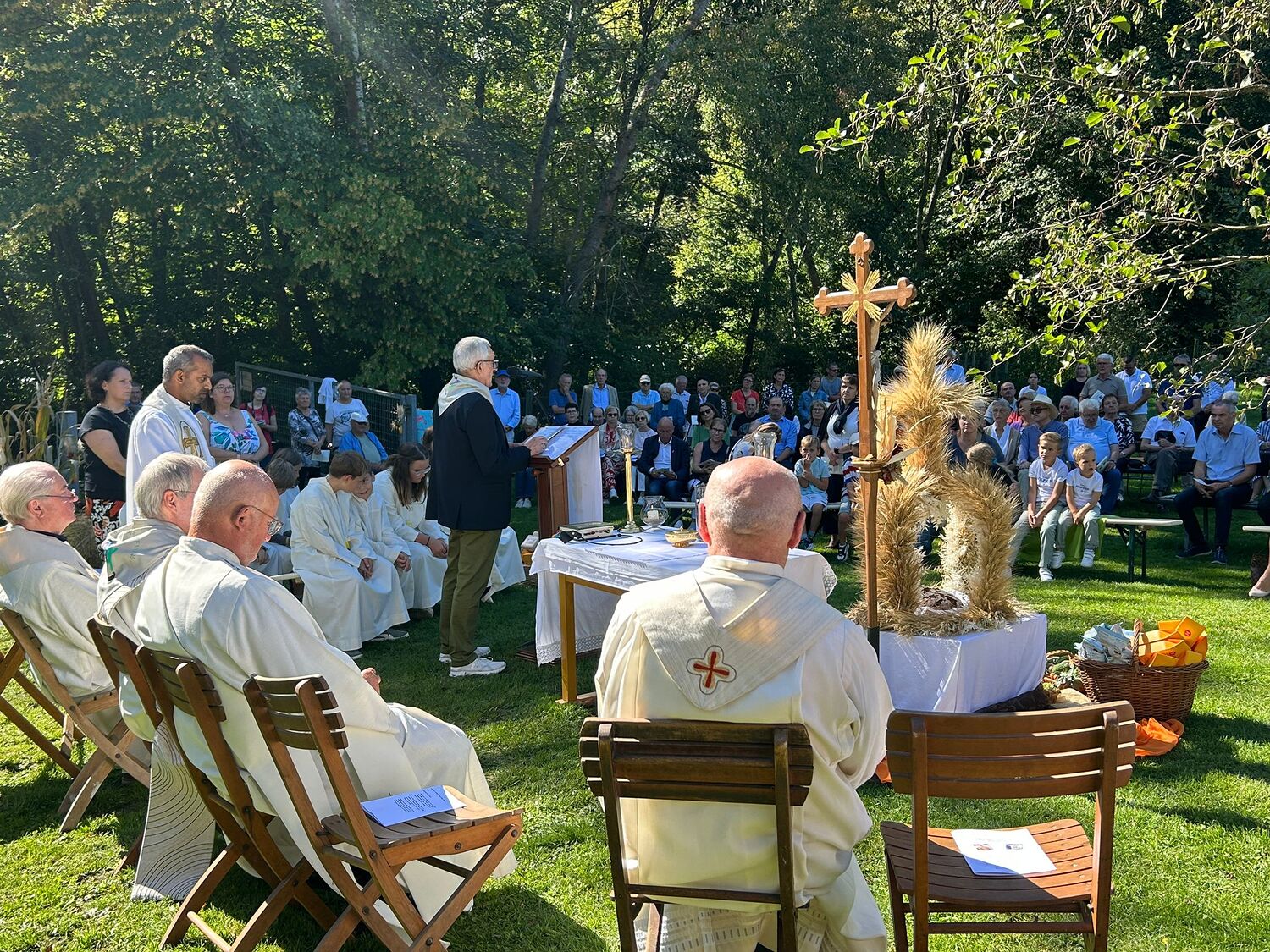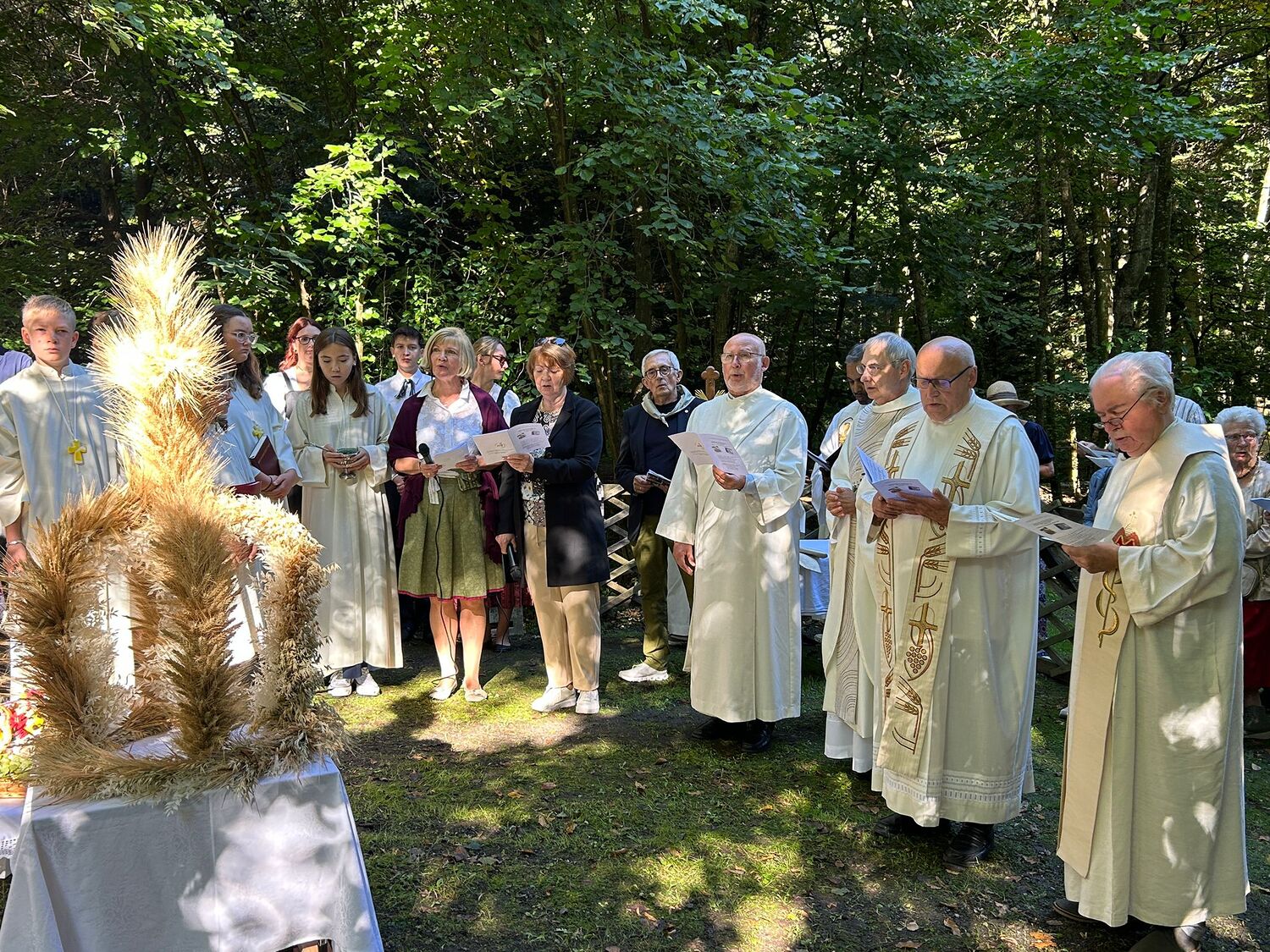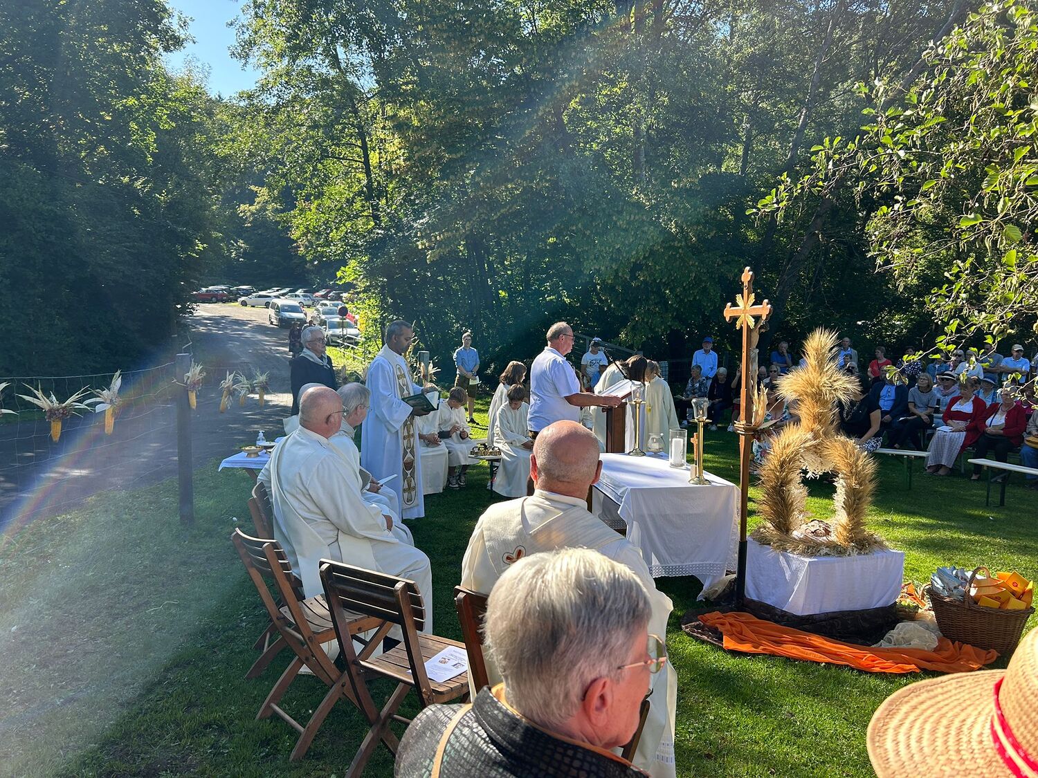 Dieses besondere Jubiläum feierten wir heuer im Rahmen des Erntedankfestes – selbstverständlich direkt am Kreuzweg. Der feierliche Festzug wurde von der Musikkapelle Kobersdorf musikalisch würdevoll angeführt. Der gemeinsame Weg begann bei der 13. Station und führte uns entlang des Weges bis zur 15. Station, wo die Heilige Messe unter freiem Himmel gefeiert wurde.