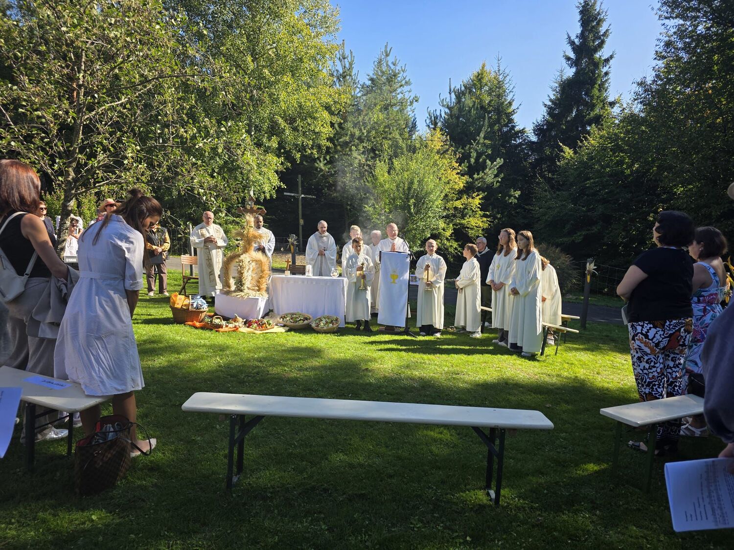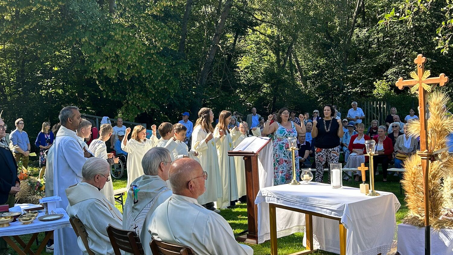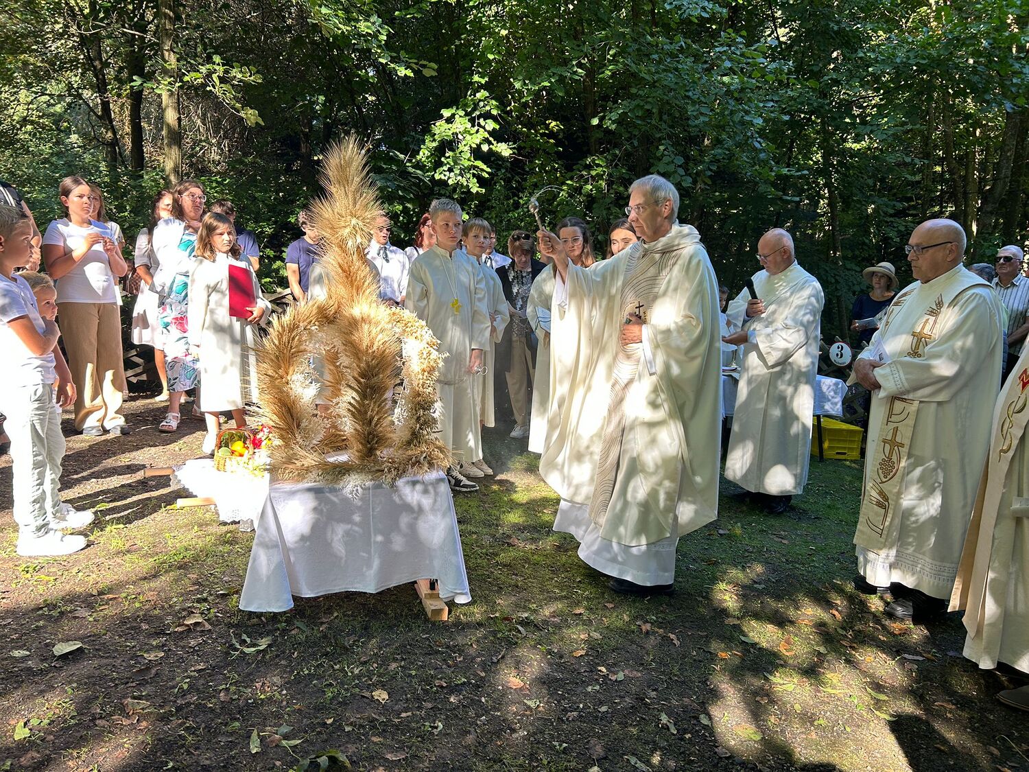 Dieses besondere Jubiläum feierten wir heuer im Rahmen des Erntedankfestes – selbstverständlich direkt am Kreuzweg. Der feierliche Festzug wurde von der Musikkapelle Kobersdorf musikalisch würdevoll angeführt. Der gemeinsame Weg begann bei der 13. Station und führte uns entlang des Weges bis zur 15. Station, wo die Heilige Messe unter freiem Himmel gefeiert wurde.