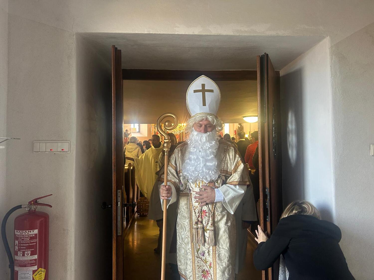 Feierlich wurde der Nikolaus von Pfarrer Shinto begrüßt. In einer kindgerechten Gesprächsrunde stellte der Pfarrer dem Nikolaus viele Fragen, die dieser den zahlreichen anwesenden Kindern verständlich und anschaulich beantwortete. Gemeinsam erklärten sie die Bedeutung der Mitra, des weißen Gewandes, des Bischofsstabes, des Ringes und des Kreuzes – Symbole, die an das Wirken und die Güte des hl. Nikolaus erinnern.