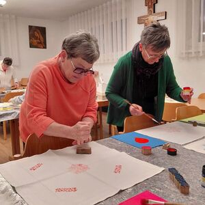 Am vergangenen Donnerstag, dem 26. März, verwandelte sich unser Pfarrheim in eine kreative Werkstatt. Unter der fachkundigen und inspirierenden Leitung von Frau Christa Fraunschiel - einer vielseitig engagierten Dame aus unserer Filiale Kalkgruben - tauchten zahlreiche Teilnehmerinnen in die faszinierende Welt des Stoff-Handdrucks ein.