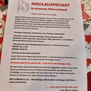 Bischof Nikolaus ging mit gutem Beispiel voran und hatte ein großes Herz für alle. Wollen auch wir in die Rolle des Nikolaus schlüpfen und jenen eine Freude bereiten, denen es nicht so gut geht. Dazu gibt es eine Sammelaktion für die Caritas und Rettet das Kind Oberpullendorf. Wir als Pfarrverband wollen den Menschen des Wohnheims und der Tagesbetreuungsstätte eine Freude bereiten und sammeln deshalb: