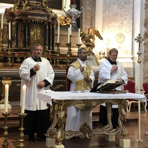 Fotos – Pfarrer Shinto mit den Reiseteilnehmern des Pfarrverbandes vor der Wotrubakirche in Wien-Mauer und Pfarrer Shinto bei der Hl. Messe in der Schlosskapelle Schönbrunn mit den Ministranten Gerhard Klafsky und Werner Schock (v.r.n.l.)