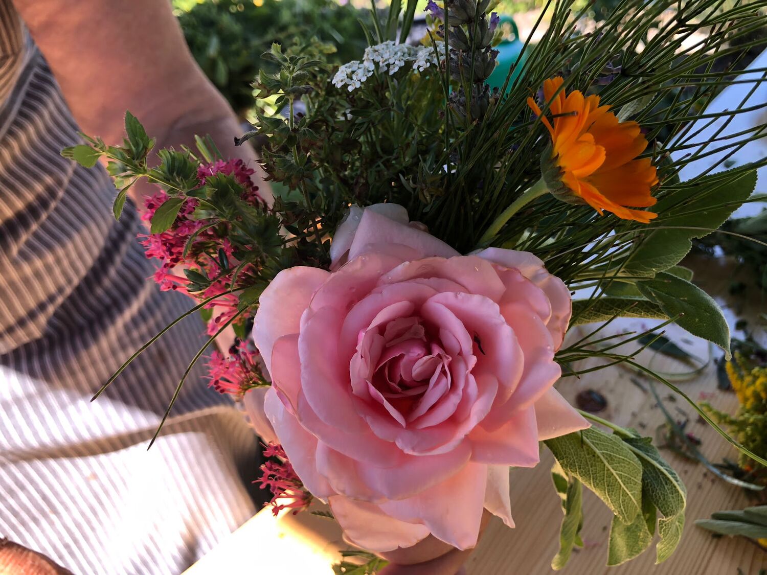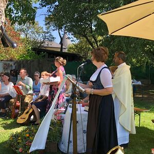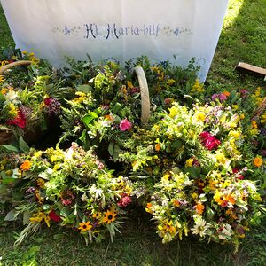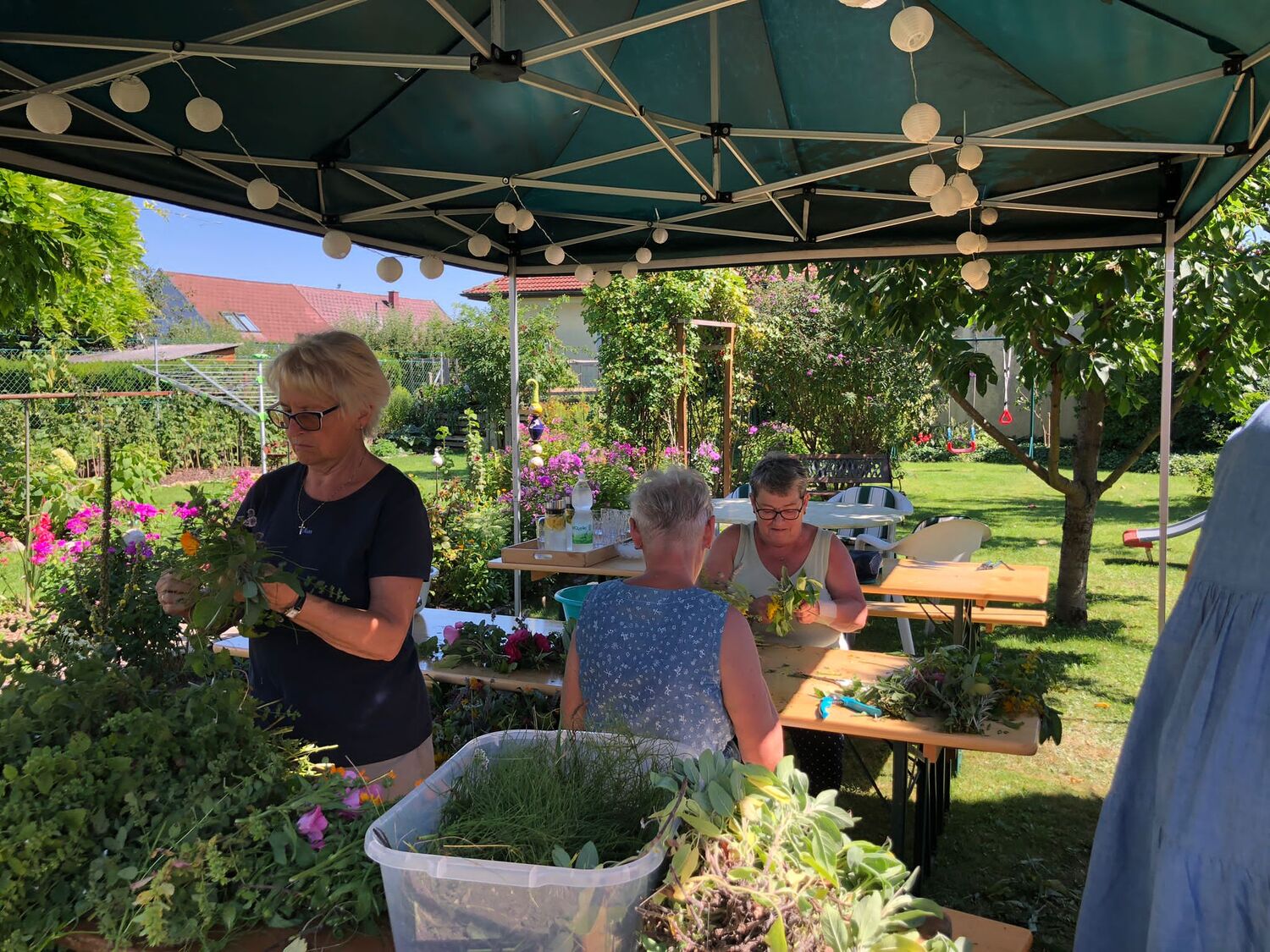 Aber nicht nur Rosen erfreuen uns im Sommer, auch Heil- und Würzkräuter entfalten ihre Kraft und Wirksamkeit. Die fleißigen Damen aus Kobersdorf haben diese gesammelt und zu kleinen Sträußen gebunden, die von Pfarrer Shinto gesegnet und anschließend an die Gottesdienstbesucher verteilt wurden.
