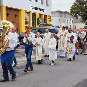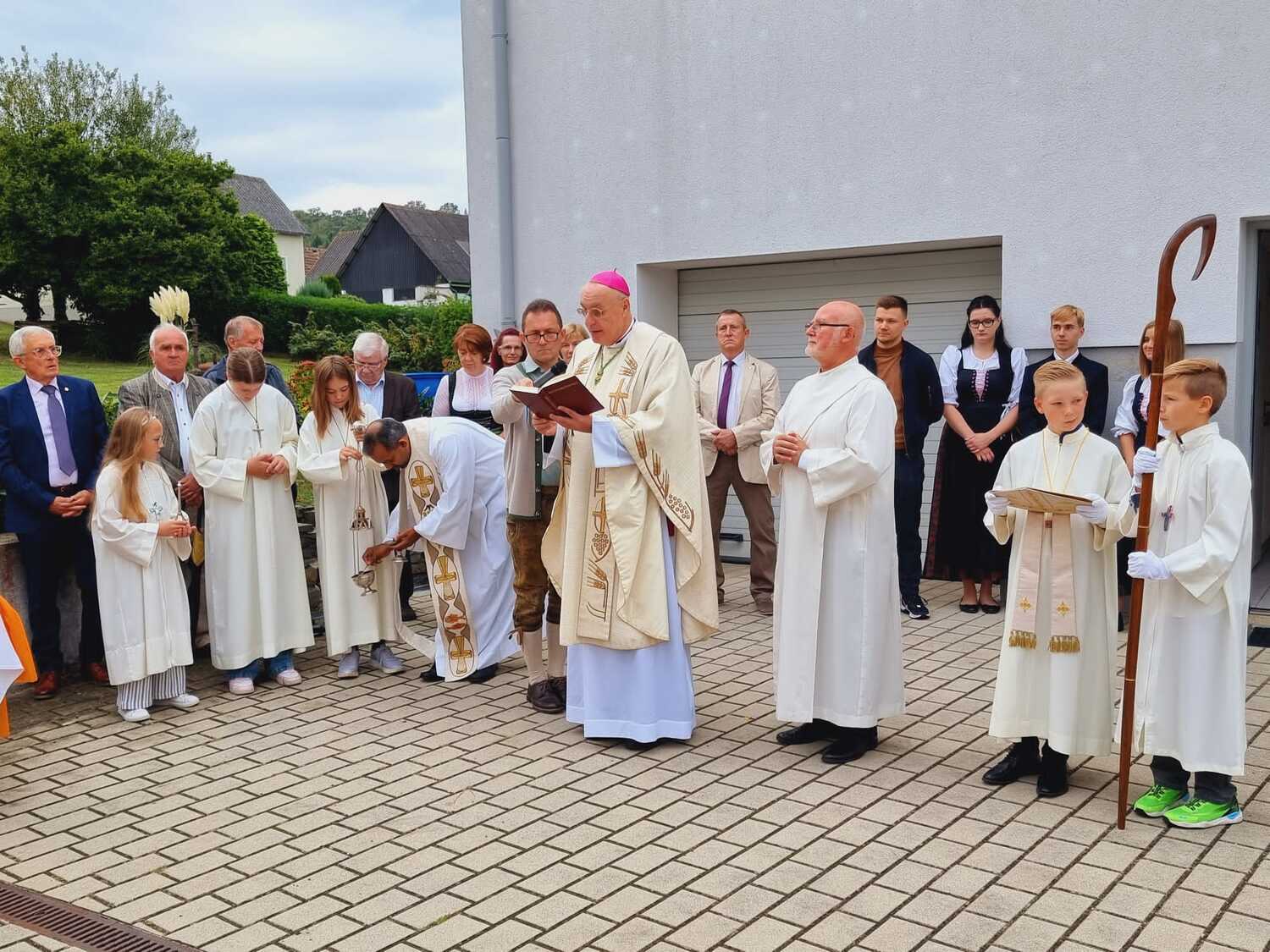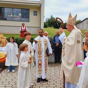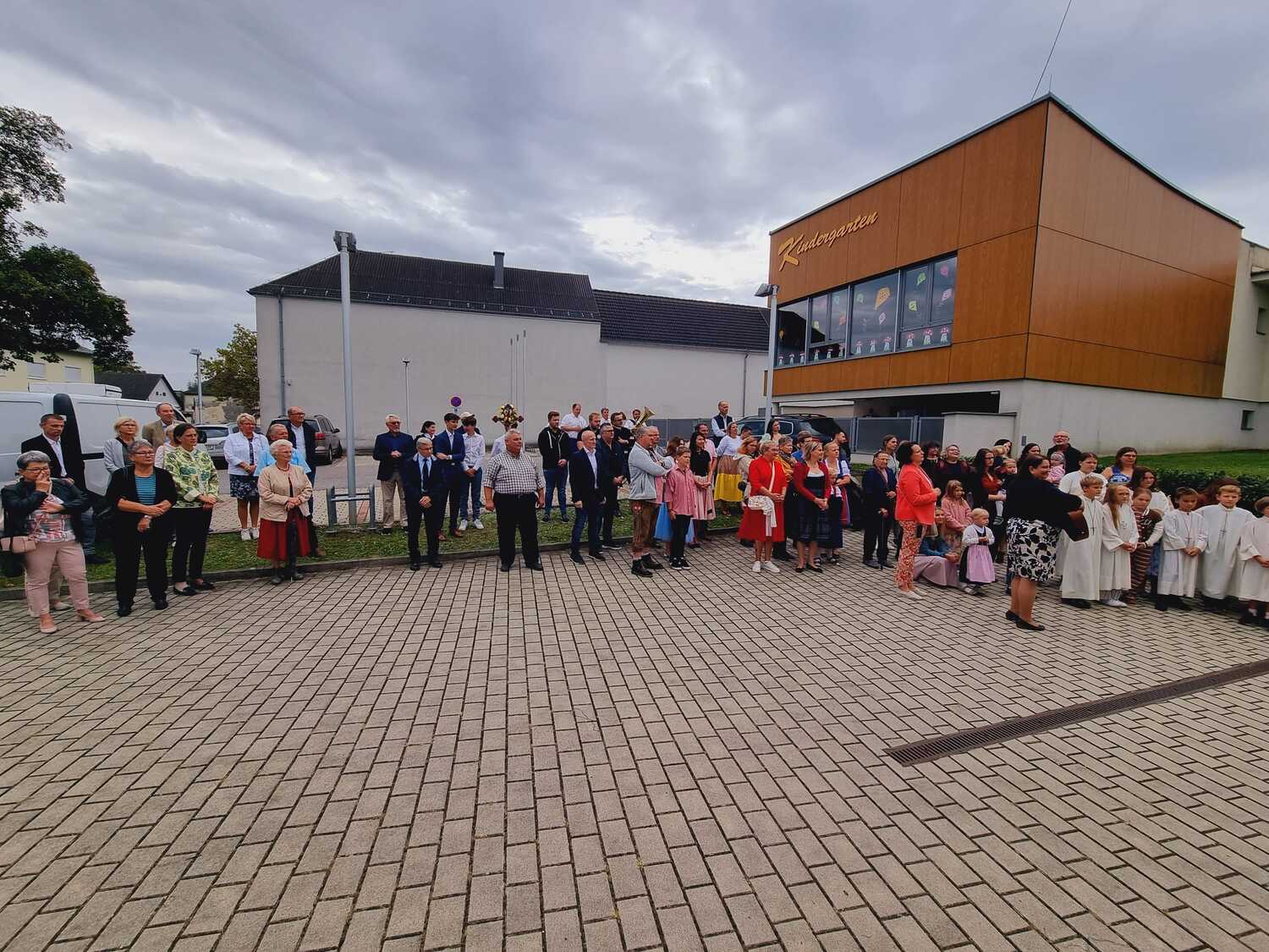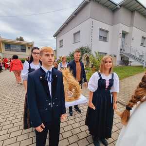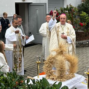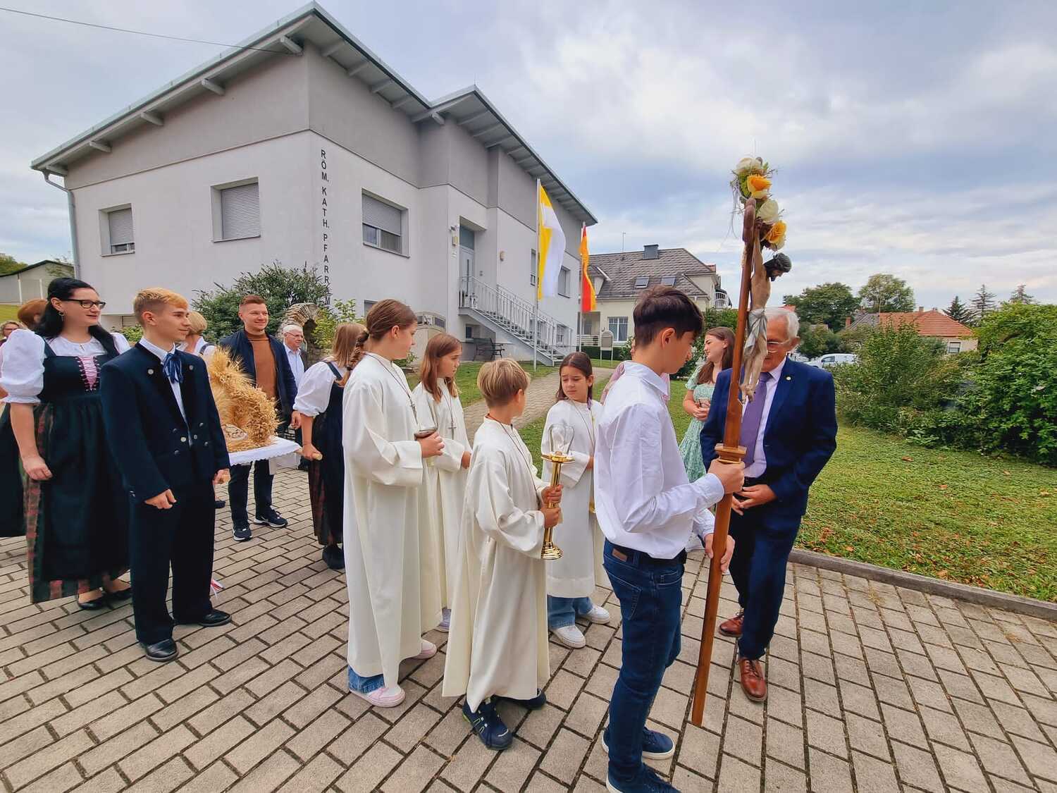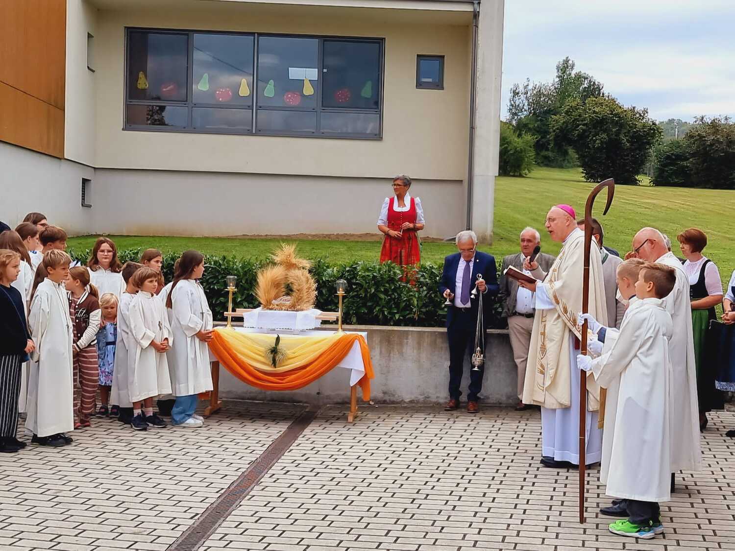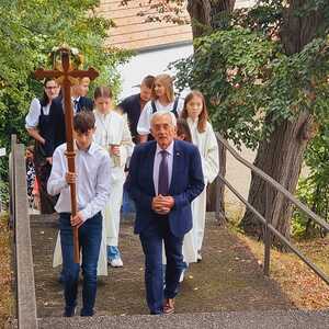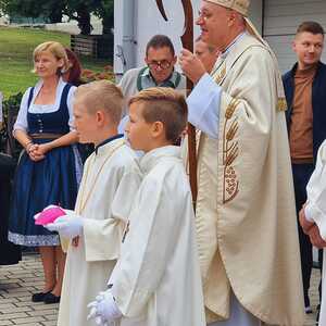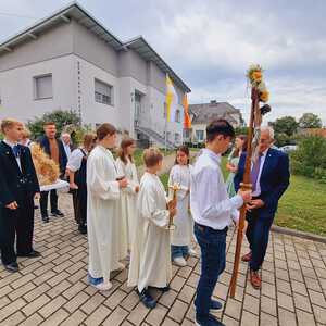 Das Kirchenvolk versammelte sich beim Pfarrhof, wo Herr Diözesanbischof Ä. Zsifkovics von den Kindern feierlich begrüßt wurde. Nach der Segnung der Erntekrone führte ein langer Festzug, angeführt vom Kreuz mit den Ministranten und der Blaskapelle Kirchschlag zum Gotteshaus, wo unser Herr Bischof dann die Segnung vornahm.