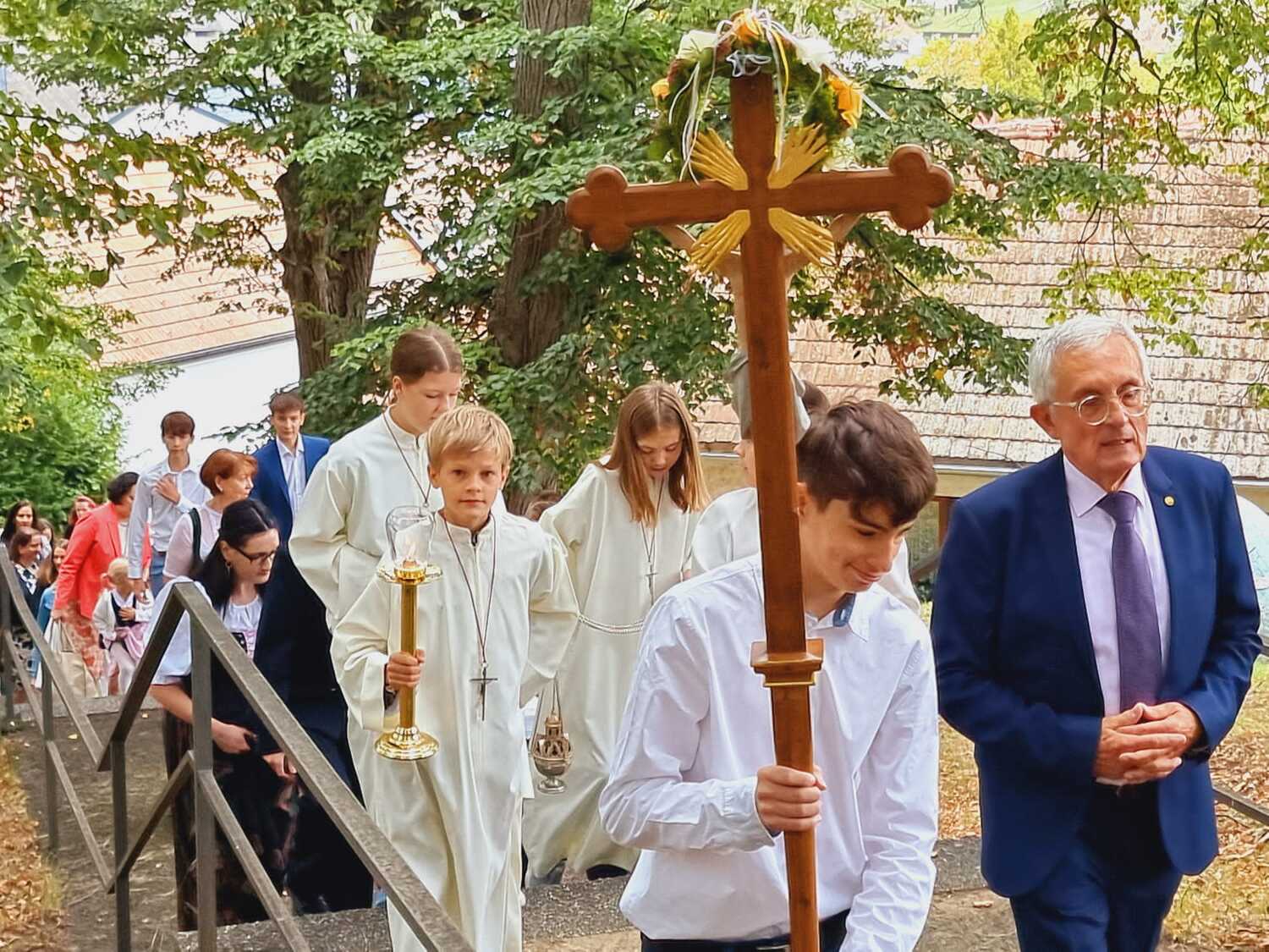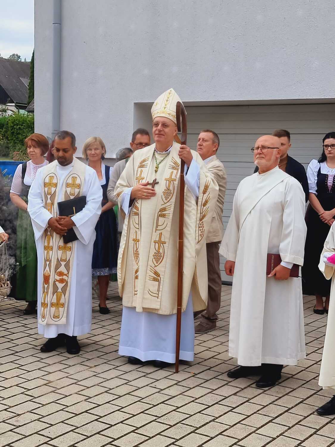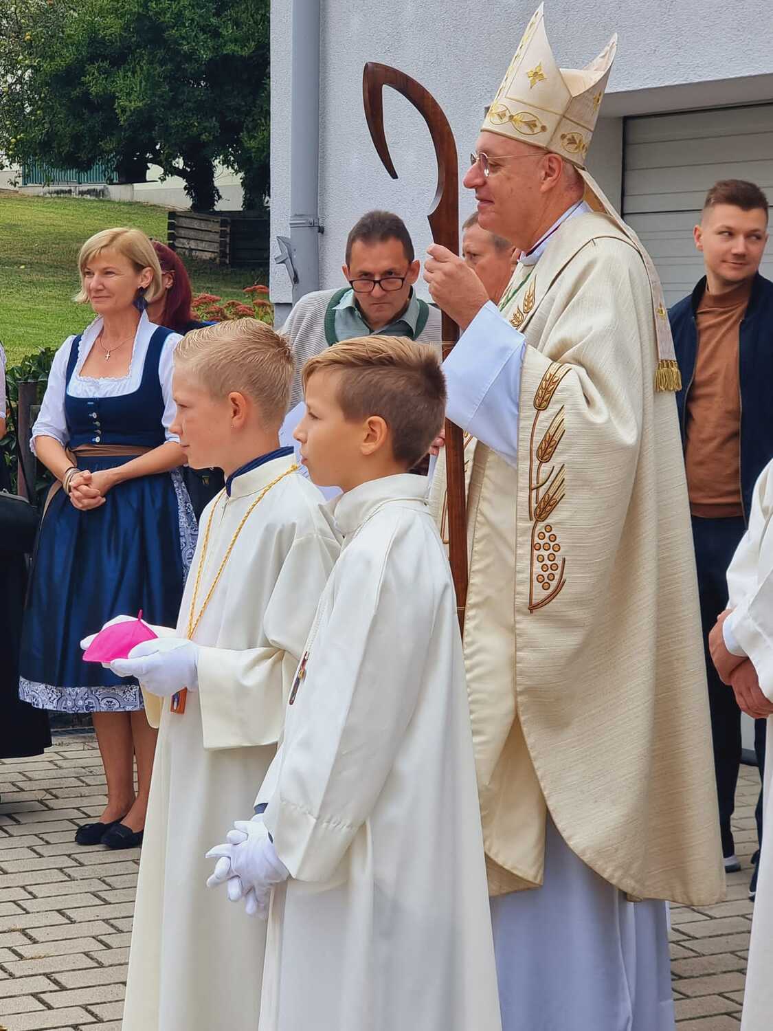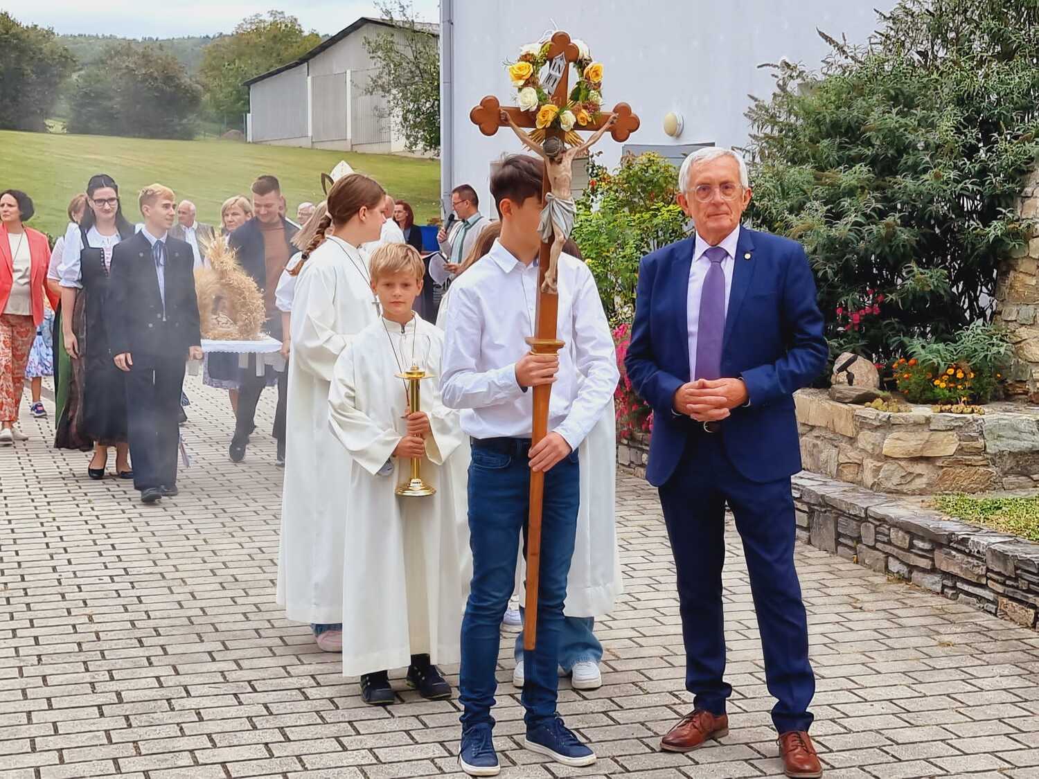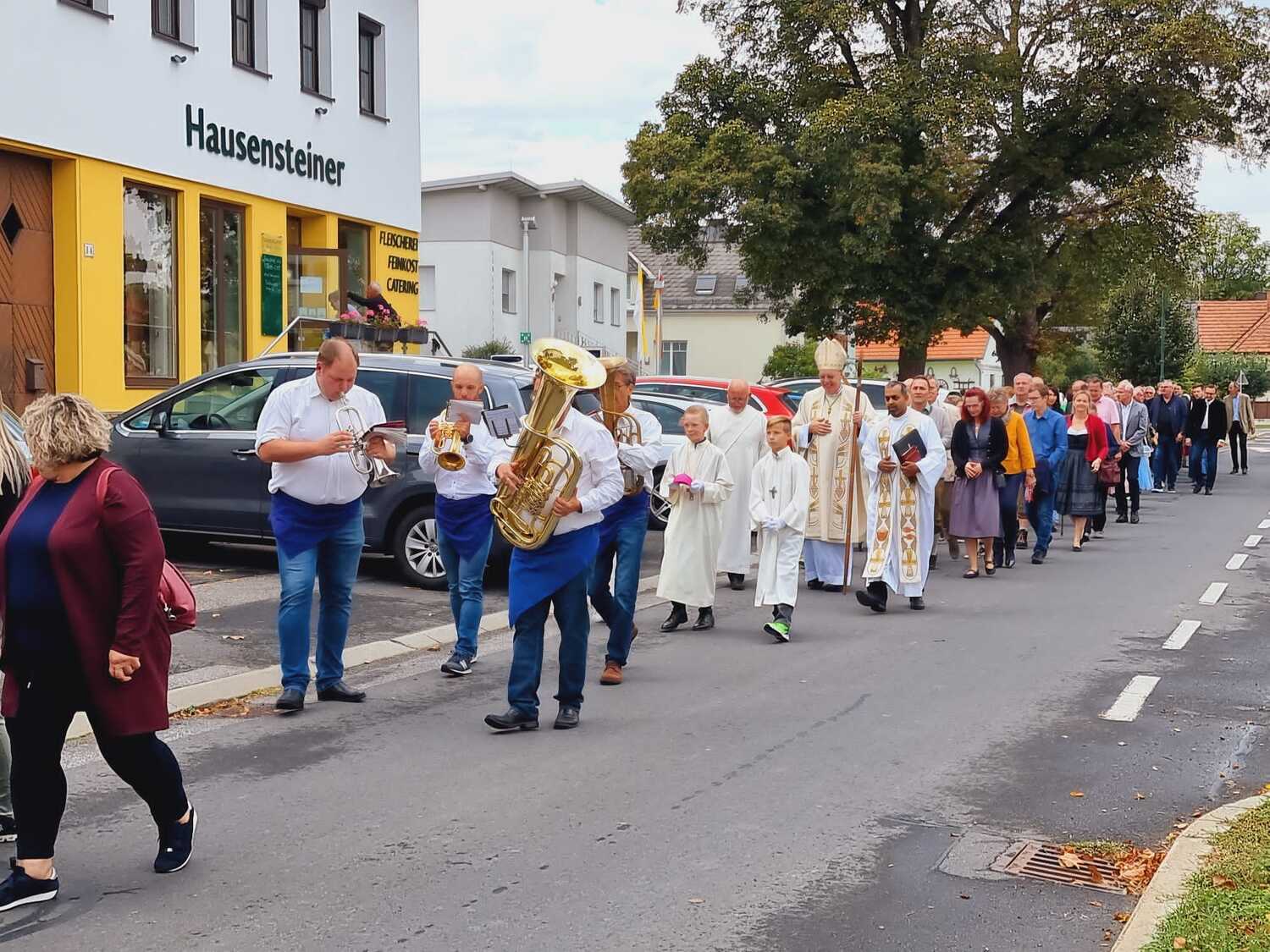 Das Kirchenvolk versammelte sich beim Pfarrhof, wo Herr Diözesanbischof Ä. Zsifkovics von den Kindern feierlich begrüßt wurde. Nach der Segnung der Erntekrone führte ein langer Festzug, angeführt vom Kreuz mit den Ministranten und der Blaskapelle Kirchschlag zum Gotteshaus, wo unser Herr Bischof dann die Segnung vornahm.
