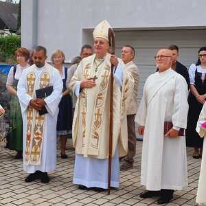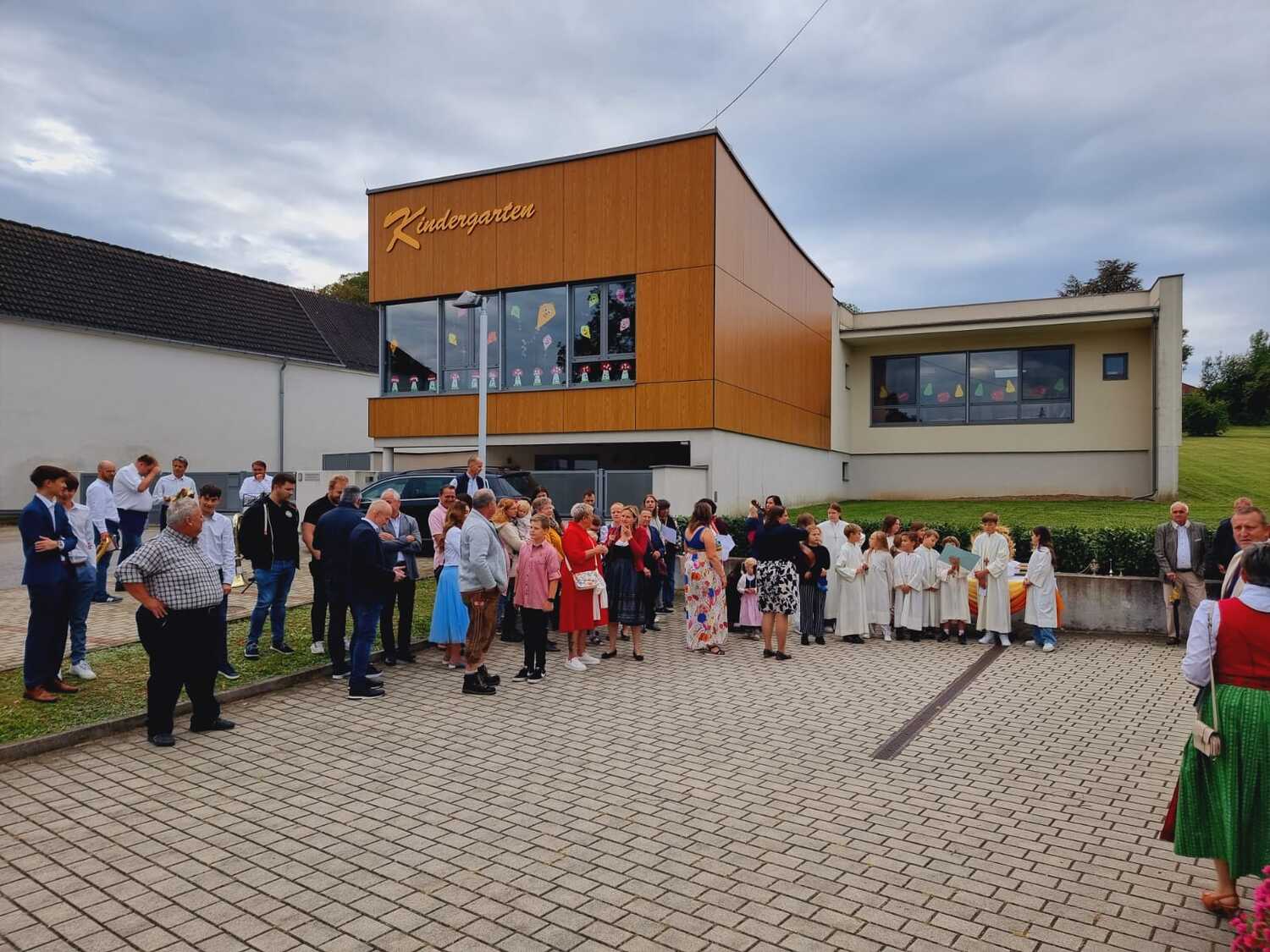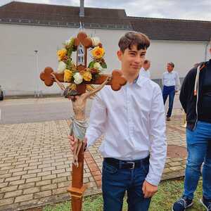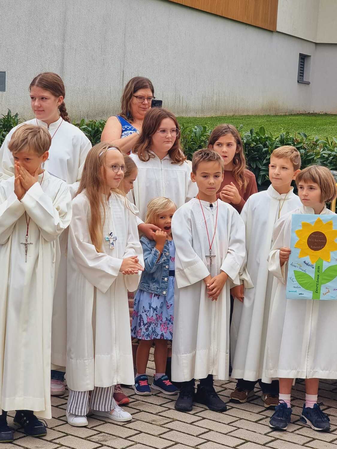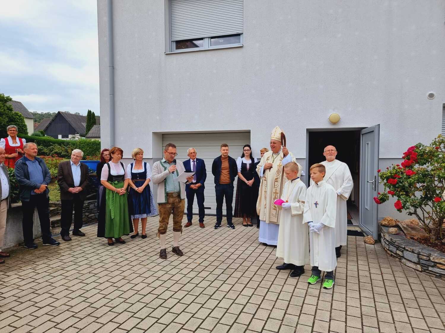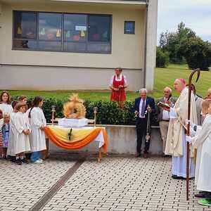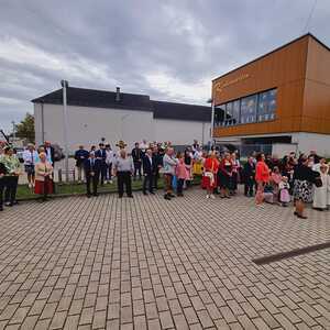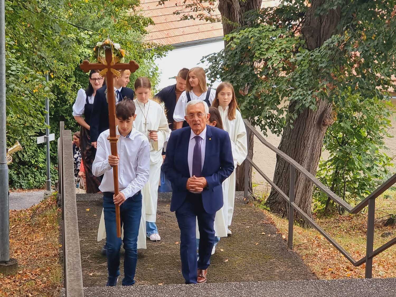 Das Kirchenvolk versammelte sich beim Pfarrhof, wo Herr Diözesanbischof Ä. Zsifkovics von den Kindern feierlich begrüßt wurde. Nach der Segnung der Erntekrone führte ein langer Festzug, angeführt vom Kreuz mit den Ministranten und der Blaskapelle Kirchschlag zum Gotteshaus, wo unser Herr Bischof dann die Segnung vornahm.