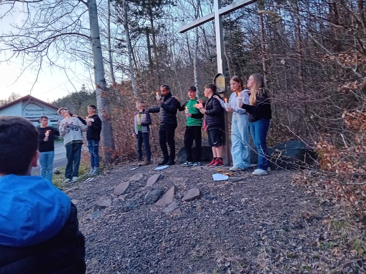 Bei der Station „Jesus nimmt das Kreuz auf seine Schultern“ wurde den Firmlingen das selbst gebastelte Weidenkreuz überreicht als Symbol der schweren Last, die manche Menschen auch heute zu tragen haben.