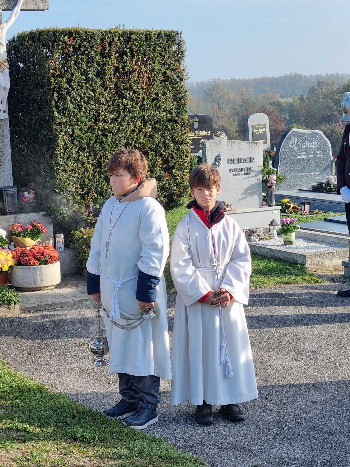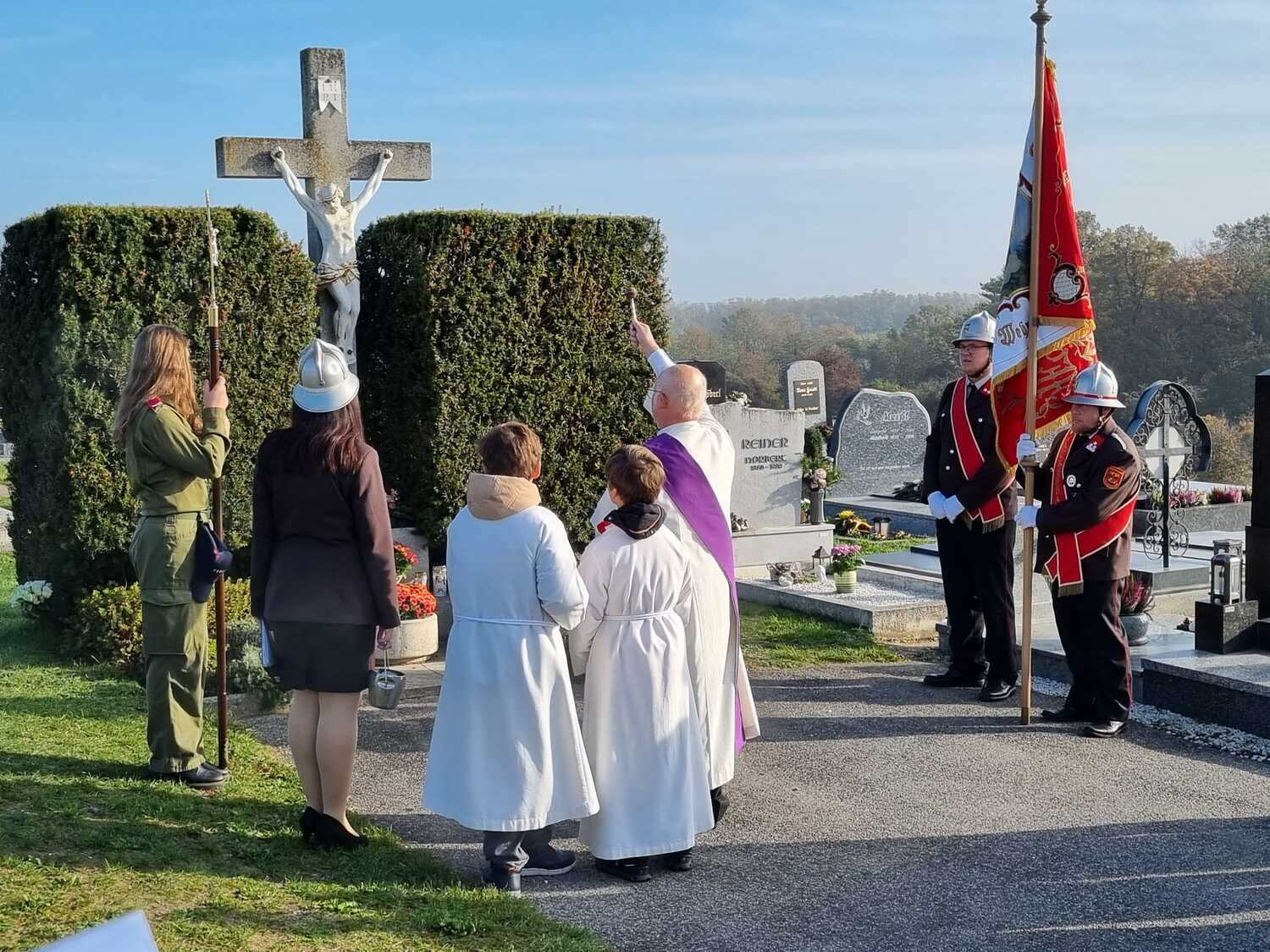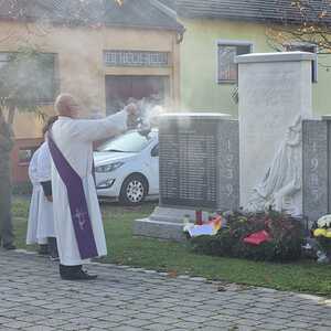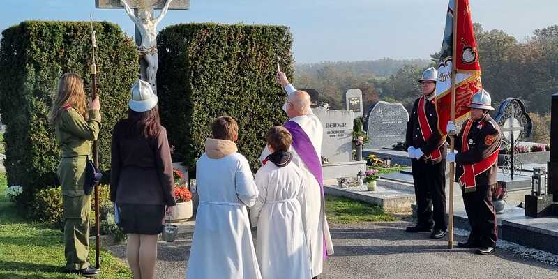 Nach dem Gottesdienst am Vormittag wurden von Diakon Zach im Beisein der Gottesdienstbesucher, der Freiwilligen Feuerwehr, der Musikkapelle und der Ministranten die Gräber gesegnet und anschließend beim Kriegerdenkmal zum Gedenken an die vielen vermissten und verstorbenen Kameraden der beiden Weltkriege ein Kranz niedergelegt.