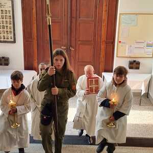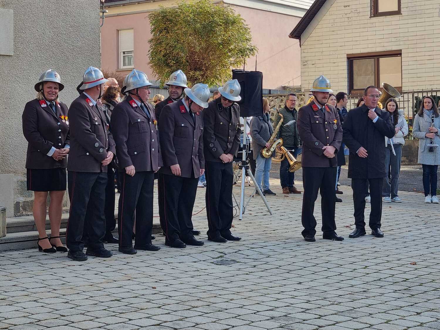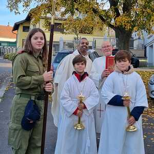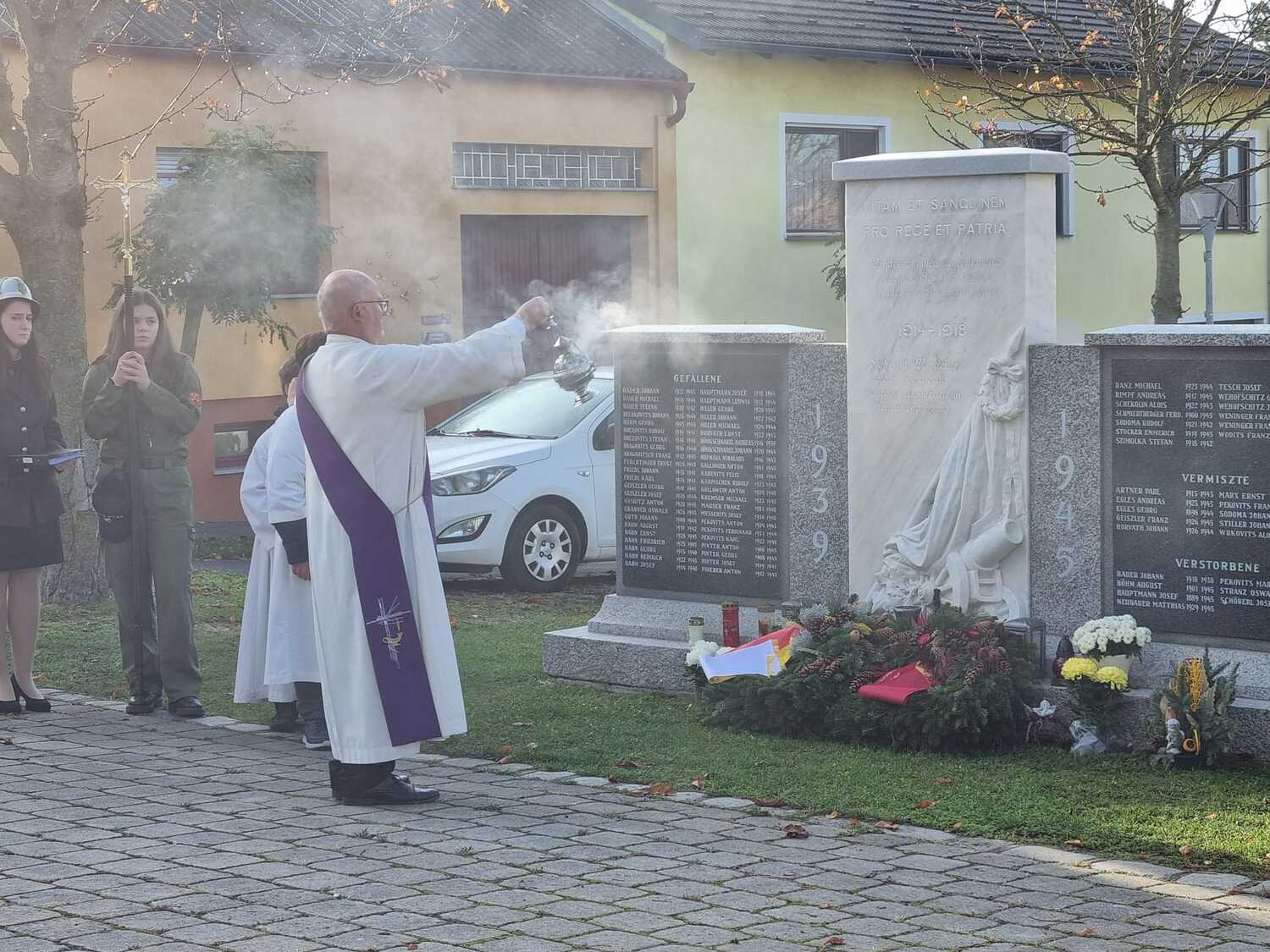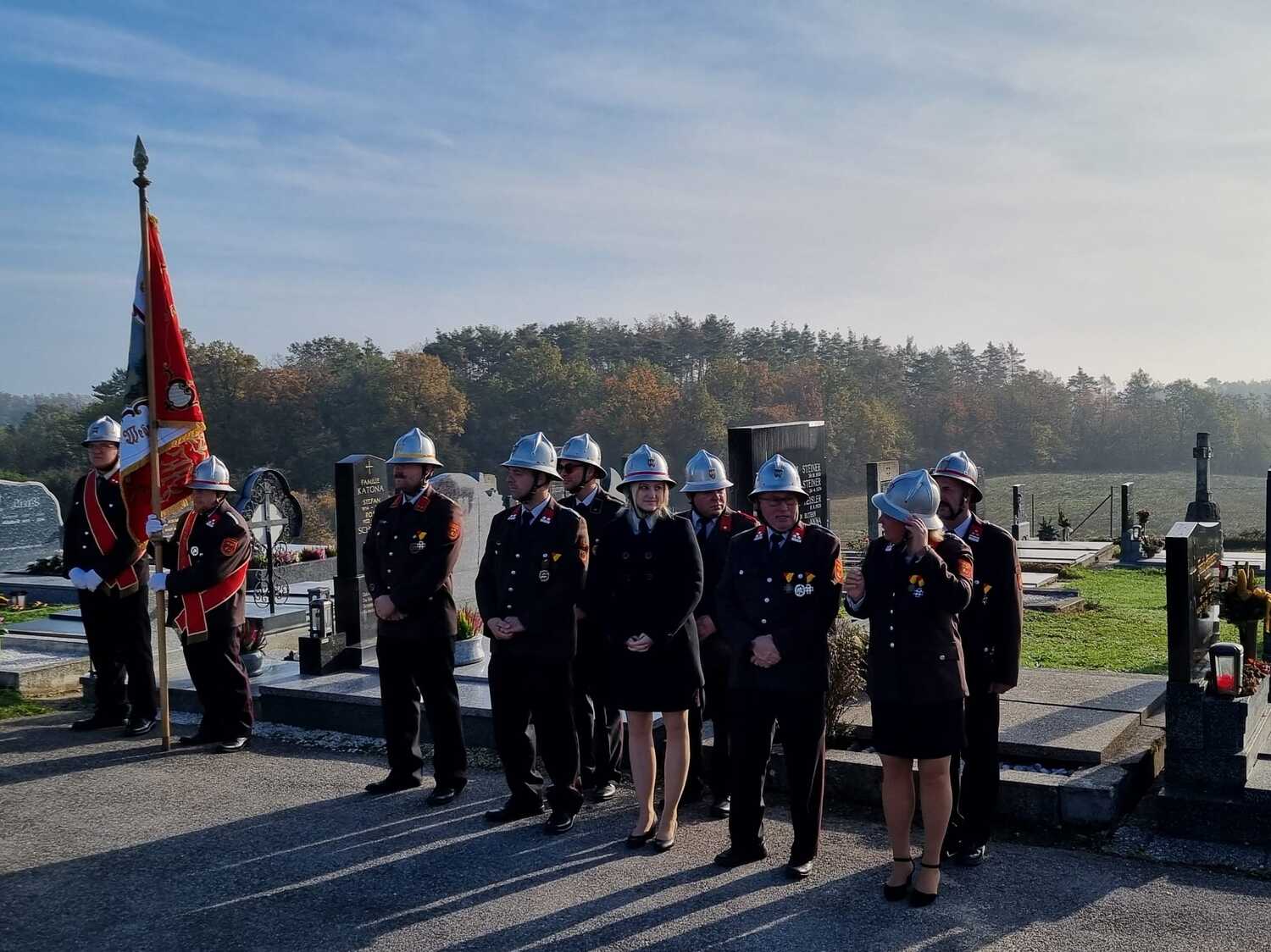 Nach dem Gottesdienst am Vormittag wurden von Diakon Zach im Beisein der Gottesdienstbesucher, der Freiwilligen Feuerwehr, der Musikkapelle und der Ministranten die Gräber gesegnet und anschließend beim Kriegerdenkmal zum Gedenken an die vielen vermissten und verstorbenen Kameraden der beiden Weltkriege ein Kranz niedergelegt.