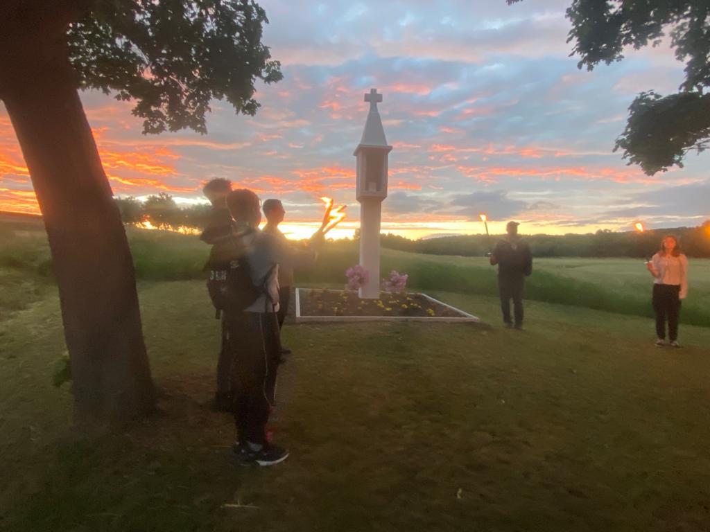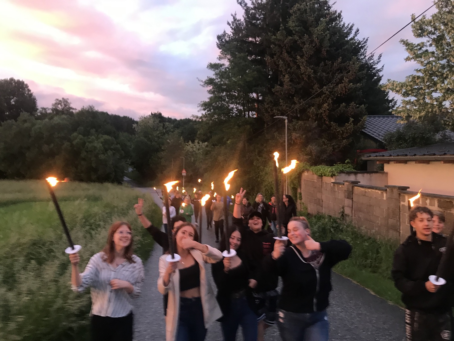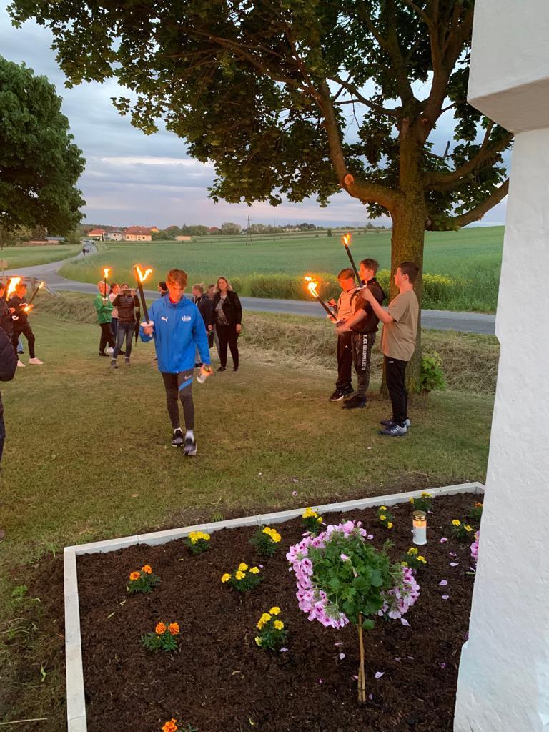 Bevor die Gruppe dann mit ihren Fackeln zur Wanderung aufbrach, gab es noch eine kleine Jause. In wunderbarer Abendstimmung mit bester Laune marschierten die Jugendlichen zur Florianisäule, wo der stimmungsvolle Abend mit einer Andacht endete.