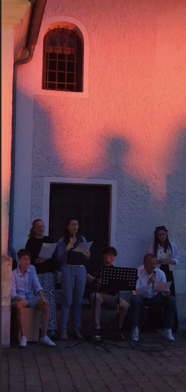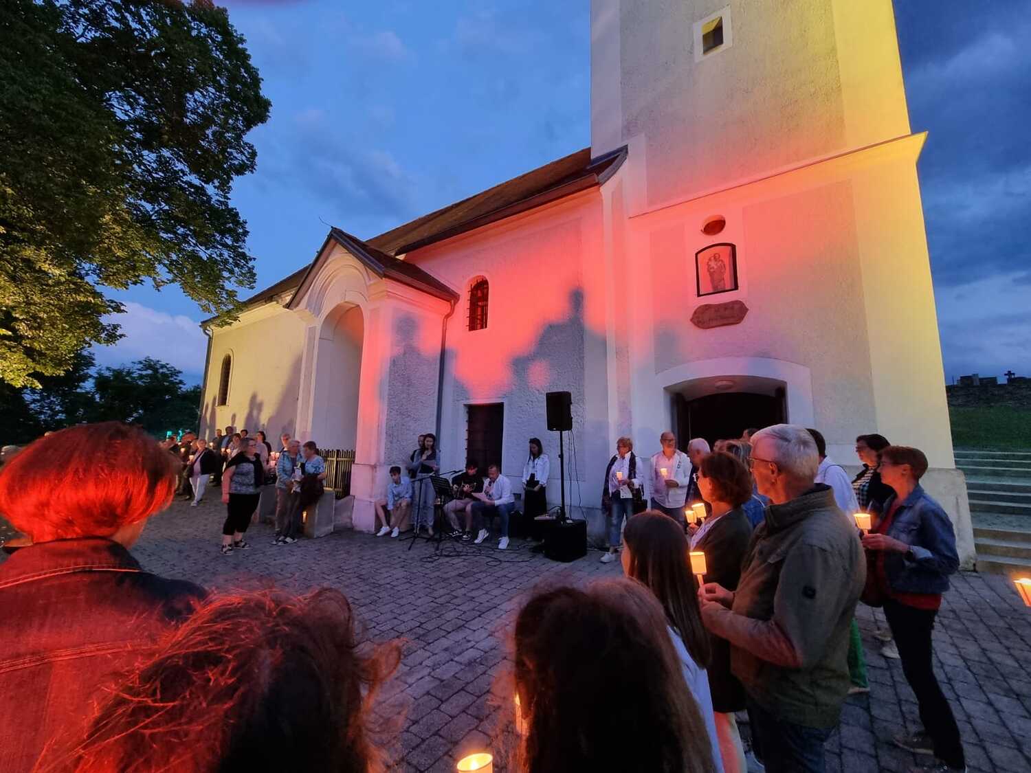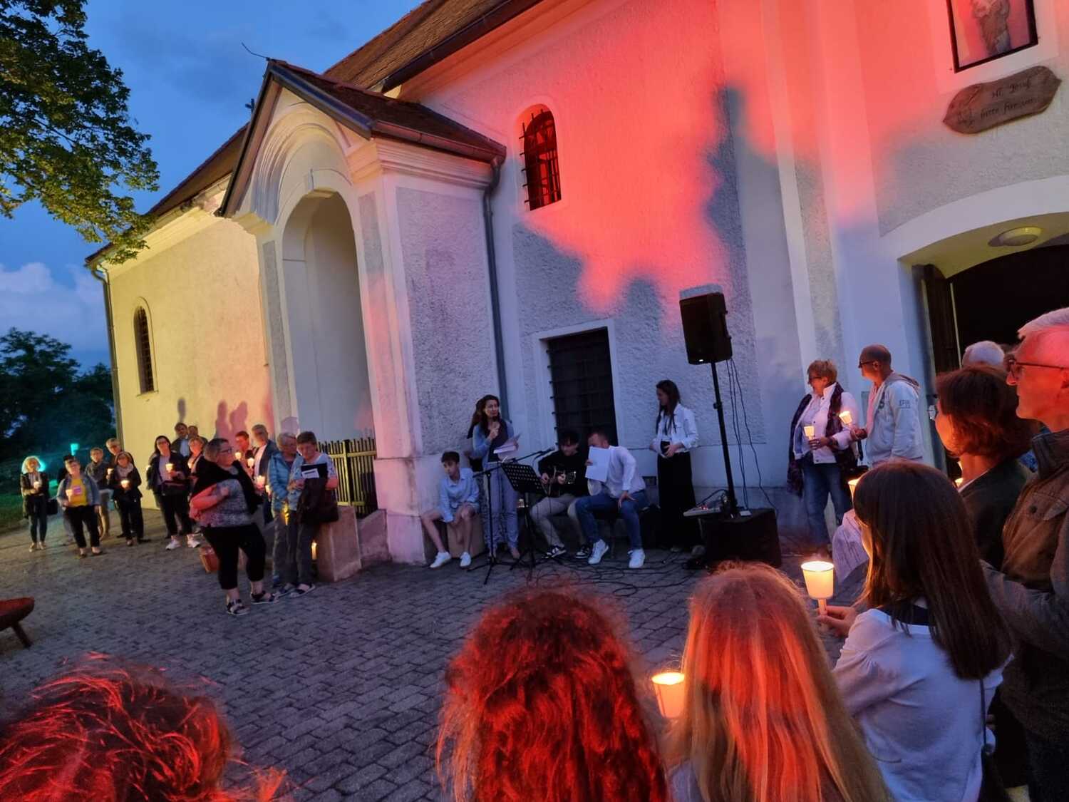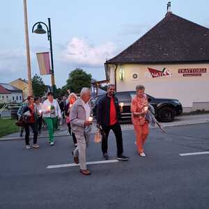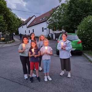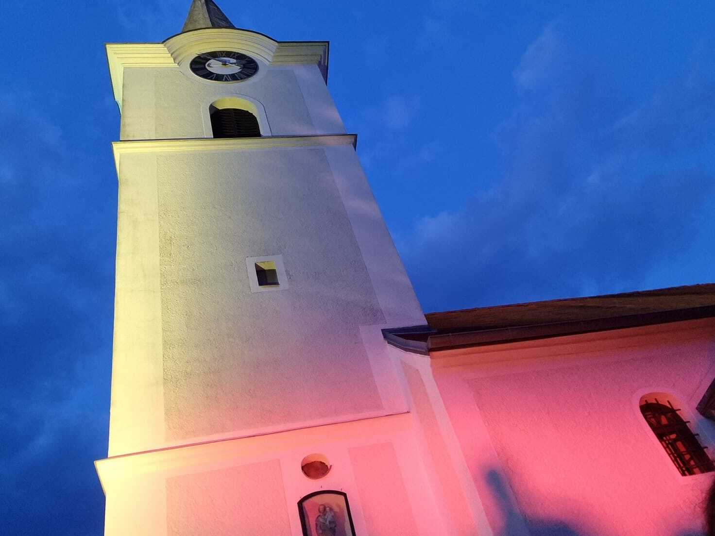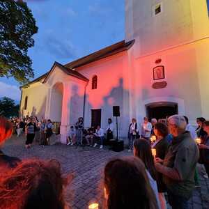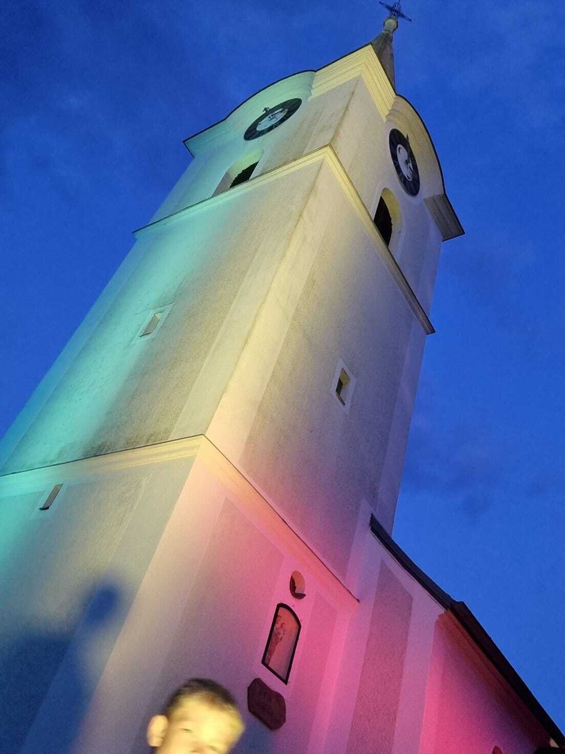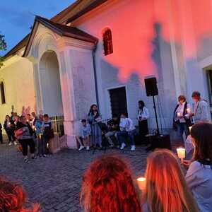 Mit einer Kerzen- und Laternenwanderung ging es nun zum Kirchenhof der katholischen Kirche. Diese war bereits in Regenbogenfarben sehr feierlich beleuchtet. Das Musikprogramm mit Bläsern und der Sängergruppe der Familie Tröscher war sehr vielfältig und unterhaltsam.