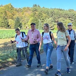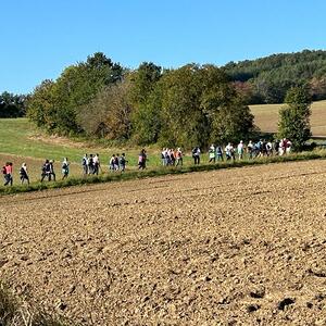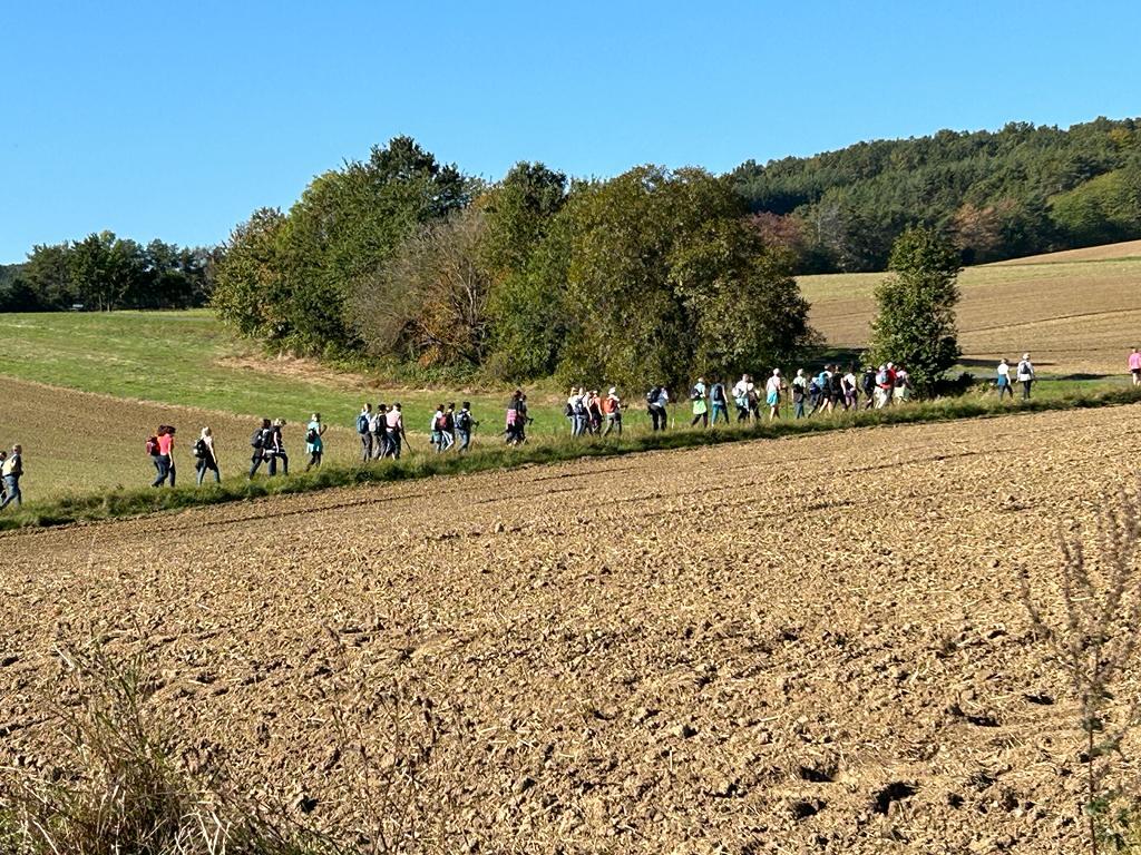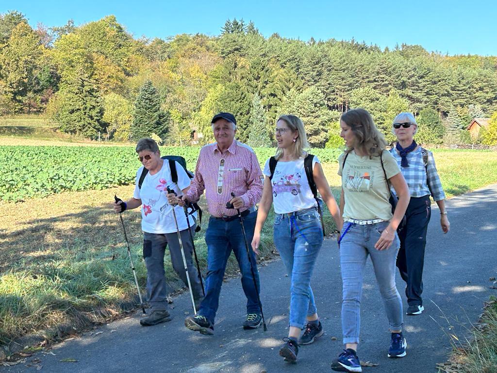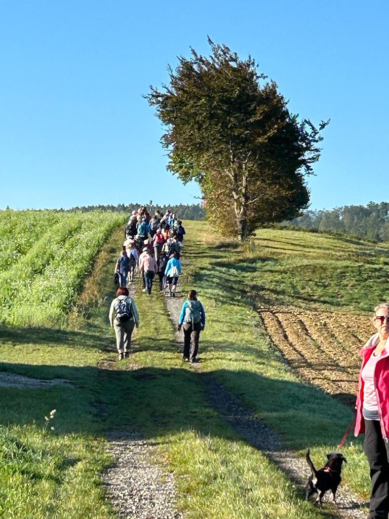 Mit diesem Gebet, mit dem gesegneten Pilgerstab und den Segen Gottes, erteilt von Pf. Shinto, machten sich 53 Frauen und 4 Männer auf den Weg um ca. 10 km bei strahlendem Sonnenschein, am Fuße der Landseer Berge zu pilgern.