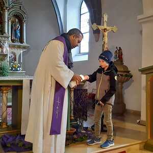 In 6 Stationen konnten die Kinder mit verschiedenen Symbolhandlungen den Weg Jesu nachgehen. Begonnen wurde zum Einzug in Jerusalem mit einem Palmzweig in den Händen mit einem gemeinsamen Lied. Zum Zeichen des letzten Abendmahles wurde Brot geteilt und gegessen und anschließend an Jesu am Ölberg gedacht und jeder durfte zum gemeinsamen VaterUnser ein Teelicht entzünden. Die Schmerzen und das schwere Leid wurde mit einer Dornenkrone und einem schweren Stein dargestellt. Zur Kreuzverehrung wurde dann das dunkle Kreuz mit bunten Blumen verschönert.