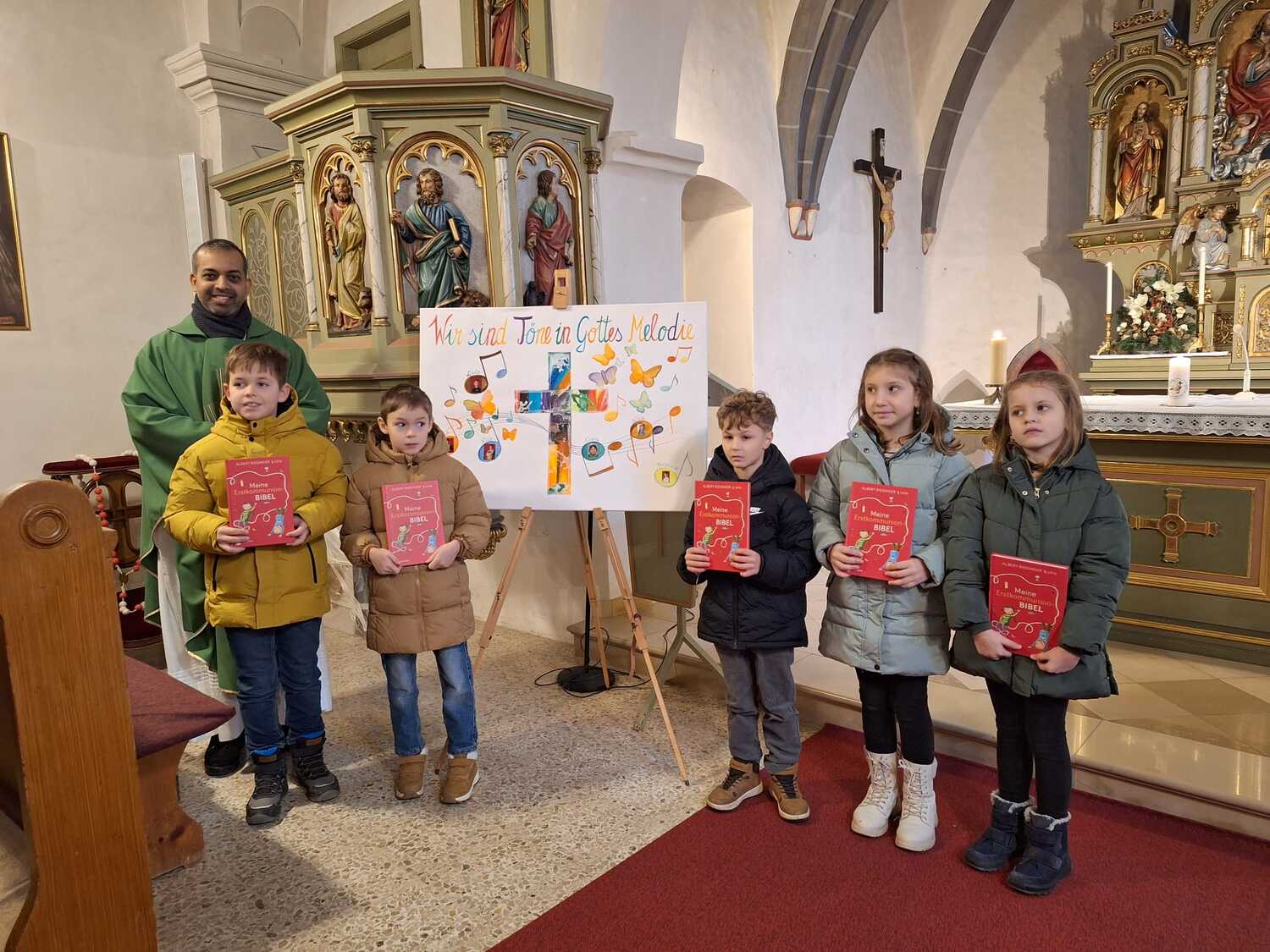 Am Sonntag, dem 19. Jänner erhielten Livio, Patrick, Nico, Ciara (war leider krank), Nina und Vanessa, die sich auf die Erstkommunion vorbereiten, eine Bibel im Rahmen der Messfeier überreicht. Die Bibel soll den Kindern ein wichtiger Begleiter sein und den Weg durch das Leben zeigen.