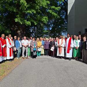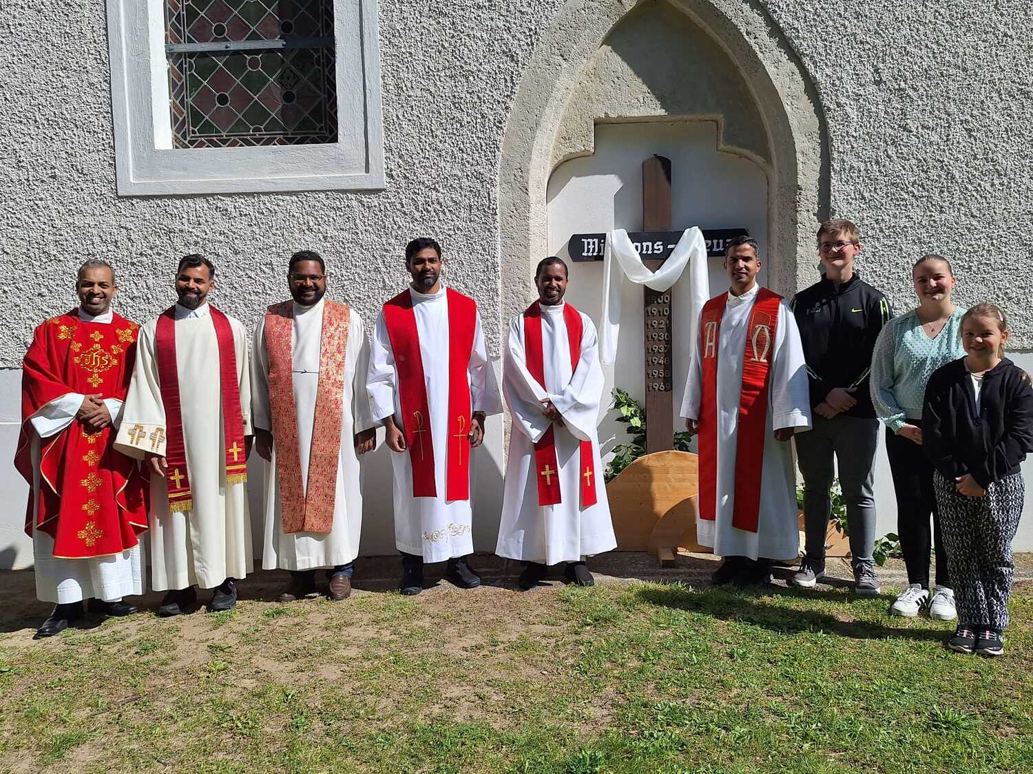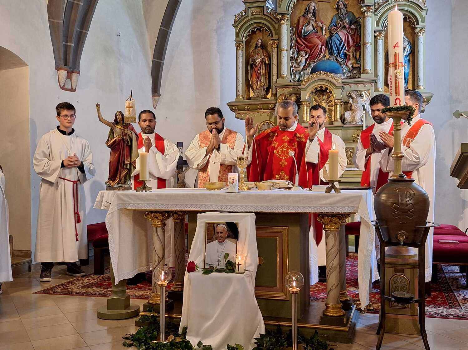 Unter der Trauergemeinde waren auch Gäste aus unserer Partnerdiözese Kanjirappally. Fünf Priesterfreunde von Pfarrer Shinto aus Kerala, die sich gerade auf Europabesuch befinden, waren Konzelebranten. Ihre Freundschaft und gemeinsamer Weg reicht in die Zeit im Knabenseminar zurück. Bevor der priesterliche Segen erbeten wurde, erhielt die Gemeinde einen Einblick in die Liturgie der Syro-malabarischen Kirche. Alle sechs Priester stimmten abwechseln ein Trauergebet an. Es beinhaltet Wechselgebete und verschiedene Psalmen, die für den Verstorbenen gesungen werden. Wir waren vom Klang und der Schönheit der Sprache Malayalam ergriffen und sehr beeindruckt.