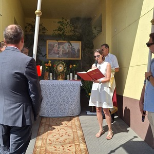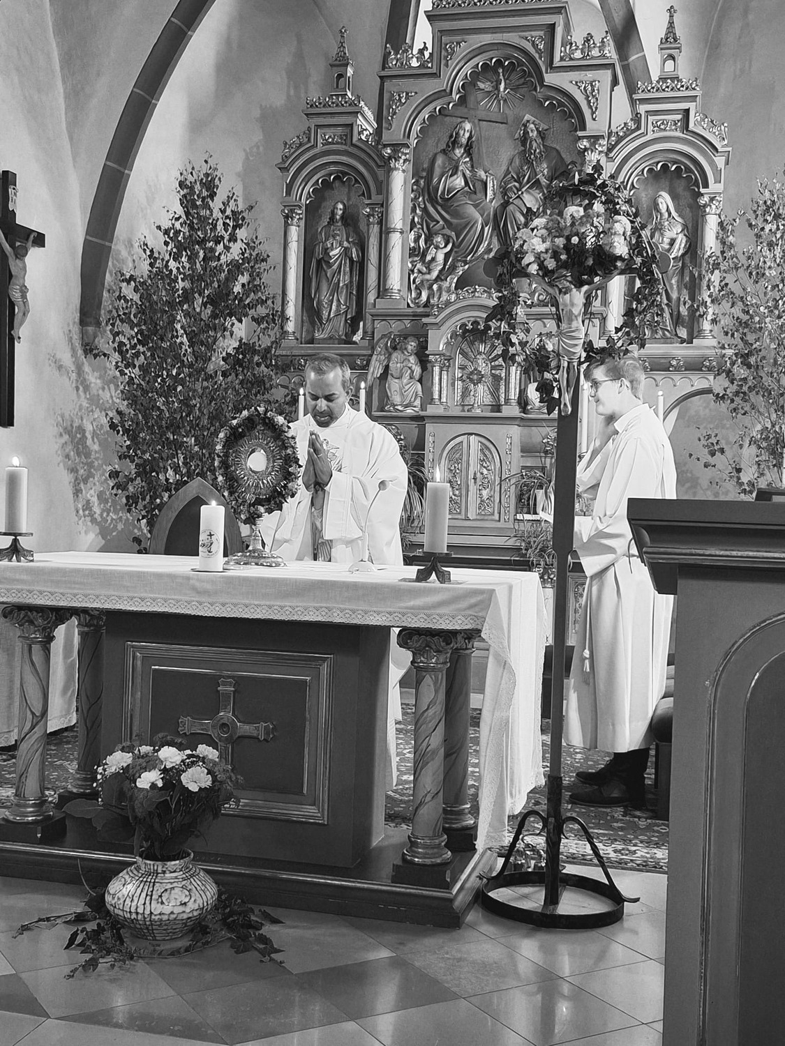 Im Anschluss an die Messe zog die Gemeinde in einer feierlichen Prozession mit dem Allerheiligsten durch die Straßen unseres Ortes. Der Weg führte zu vier festlich geschmückten Altären, die von engagierten Gemeindemitgliedern liebevoll vorbereitet worden waren. An jedem Altar wurde das Evangelium verkündet, Fürbitten gehalten und der sakramentale Segen gespendet.