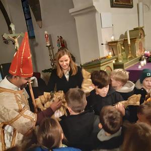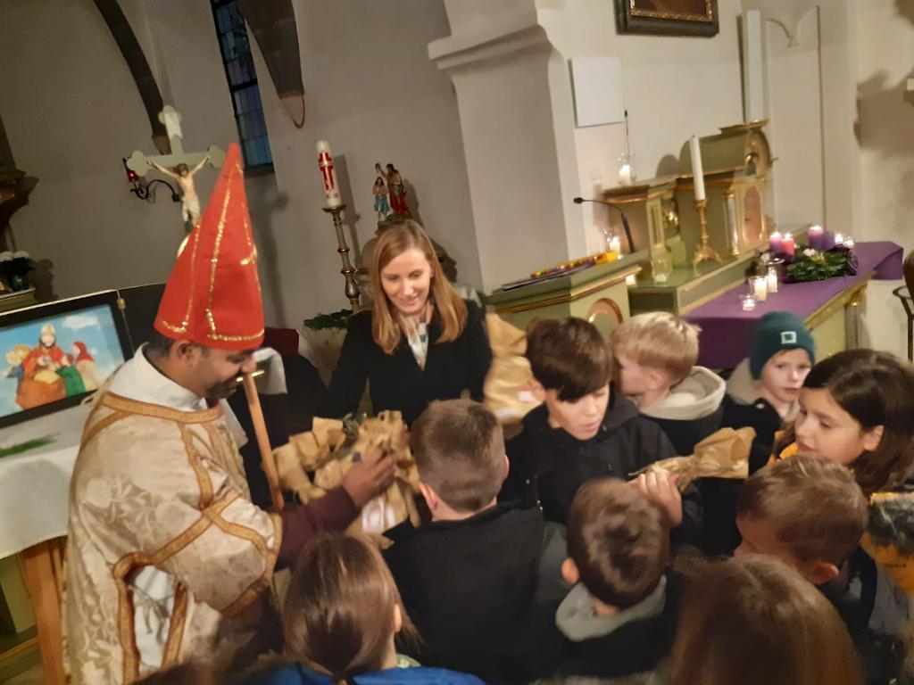 Nach einer kurzen Begrüßung stellten Pfarrer Shinto und Jungscharleiterin Katja den Heiligen Nikolaus vor, in dem sie in Form eines Erzähltheaters eine Geschichte – die Legende der Schiffsrettung - erzählten und anschließend wurde die Kleidung (Bischofsmantel, Mitra, Zingulum, Brustkreuz und Bischofsstab) des Hl. Nikolaus den Kindern erklärt.