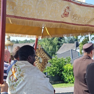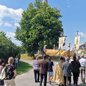Bei sommerlichen Temperaturen fand nach der Heiligen Messe die Fronleichnamsprozession statt. Die Monstranz wurde durch die Ortschaft getragen und bei zwei Stationen spendete Pfarrer Basil den Eucharistischen Segen.