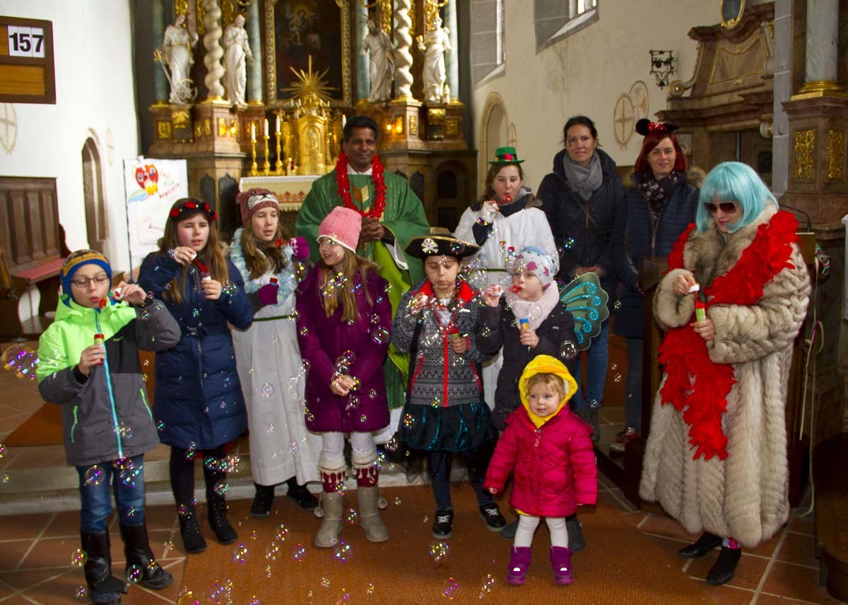 Bereits zum 2. Mal fand unsere Faschingsmesse statt. Mit den verkleideten Kindern wurde im Pfarrbüro gebastelt, gesungen und getanzt. Zu der Kommunion sind wir gemeinsam in die Kirche zurückgekehrt, wo wir unser einstudiertes Lied vorgesungen hatten. Nach dem Schlussgebet haben die Kinder Seifenblasen geblasen und Gedanken zum Fasching vorgetragen. Das lustige Fest ging mit dem anschließendem Pfarrkaffee zu Ende. Danke an Lady Gaga, dem Kücken, der Inuit, dem Schmetterling, der Piratin, dem Robin Hood und der La Catrina