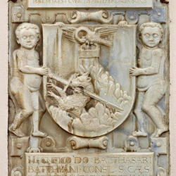 In der Südfassade sind zwei Grabplatten eingemauert:Die linke Platte ist dem protestantischen Grundherrn Balthasar Batthyány (1543-1590) gewidmet. Die Rechte zeigt vermutlich Franz I. Batthyány (1497-1566).