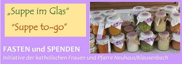 Am Sonntag, dem 15. März 2026, können Sie von 9.30 – 10.00 Uhr und von 11.00 – 11.30 Uhr, also vor und nach der hl. Messe, hausgemachte Suppenvariationen im Glas gegen eine Spende mit nach Hause nehmen.